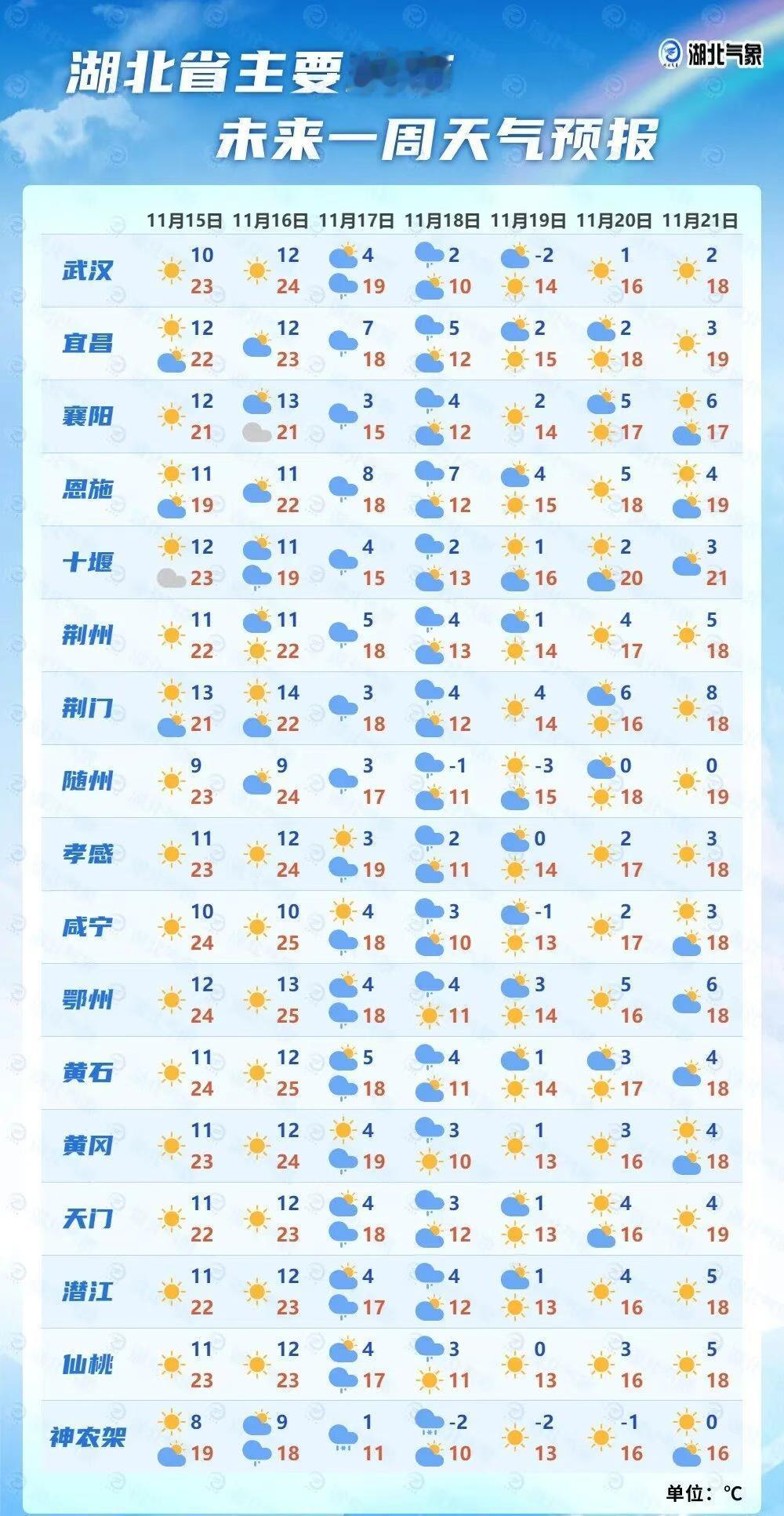【最低-3℃!湖北下半年首场寒潮大风雨雪天气来了】今天(11月15日)湖北省还是暖暖的秋,明天(11月16日)随着今年下半年首场寒潮逐渐逼近,天气将发生巨大变化。预计11月16日下午至11月17日,湖北省将有寒潮大风天气,平均气温下降8~14℃,偏北阵风7~9级,鄂西山区有雨夹雪或雪(1200米以上高山区中到大雪,积雪深度2~5厘米),11月18日至11月23日天气转好,气温逐步回升。 预计11月18日早晨,最低气温0℃线将至湖北北部一带,南部下滑至3~6℃,省内大部气温将创今年下半年来新低。提醒大家,此轮寒潮天气来势汹汹,需提前做好防范措施,雨雪天气将导致道路湿滑、结冰、能见度下降,出行注意交通安全。及时关注气温变化,添加衣物,以免着凉。