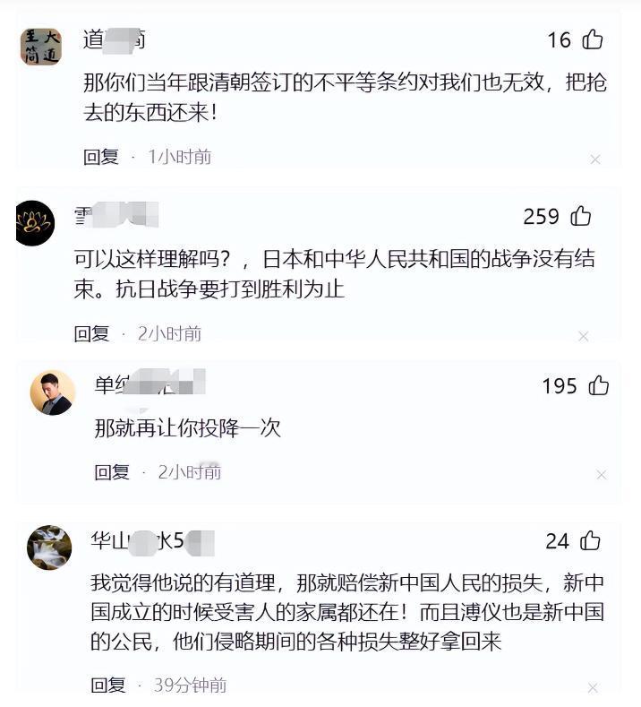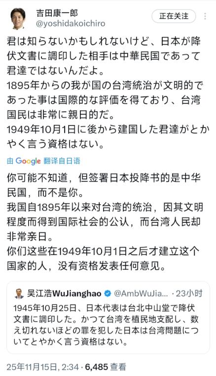 日保守派议员:签投降书的是中华民国,新中国没资格发表意见 麻烦看官们右上角点击一下“ 关注”,既方便您进行讨论和分享,又能给您带来不一样的参与感,感谢您的支持! 日本政坛这些年像是被一股倒着吹的风扫过,越往前走越往后看,吉田康一郎那句“新中国没资格评价日本投降书”的怪论,就是这阵风里最刺耳的一声,他把一段本该写进教科书、铭记在心的战争历史,硬生生扭成一场“话术游戏”,说得一本正经,好像只要挑明签字那天是谁坐在桌子前,就能把战争责任重新洗牌似的,可问题是,历史不是靠嘴皮子改写的,国际法也不是靠谁喊得大声就能重来一遍。 他那番话听着嚣张,其实透露出一种深层的焦虑,日本右翼政客这些年,说话的底气越来越奇怪,不是因为他们忘了投降,而是因为他们心里越来越不愿意承认。 战争责任这件事,日本从没真正扛过,一直是擦一擦、抹一抹,能糊弄一天算一天,难怪一遇到台湾问题,他们立刻语气变硬,仿佛一百多年前的殖民统治不是血腥压迫,而是什么“文明贡献”。这种认知,说轻了是荒唐,说重了是危险。 可要说起历史,最该讲清的恰恰是他们最不愿提的那部分,台湾为什么会落入日本手里?因为《马关条约》,因为甲午战败,因为一场彻头彻尾的侵略,至于“台湾人民非常喜欢日本”这种说法,完全是把殖民压迫下的“不得已”当成“真感情”,雾社事件里,人家原住民被逼到绝境,用最悲壮的方式反抗,而日军用毒气、机枪回敬,这就是所谓的文明?换来的不是爱戴,是白骨累累。 国际社会哪一次承认了日本对台湾的统治合法?没有一回,二战结束时,《开罗宣言》和《波茨坦公告》写得明明白白,日本夺取的领土全部归还中国,1945年那份投降文件也说得清楚,日本在中国战区无条件投降,只是日本右翼不愿提,因为这些事实每一次被提起,他们的“殖民怀旧”就会裂一道口子。 更让人担心的是,这种言论不是吉田一个人的奇葩脑回路,而是整个日本政治右倾化的外溢,参政党开始登上台面,靖国神社门前的脚步声越来越密,教科书里把侵略描写成“进军”,军费突破纪录,连反击能力、远程导弹都摆上了预算,所有这些拼在一起,日本社会正在走一条不太友好的老路,像是一辆刹车坏掉的电车,正往历史的阴影区滑去。 要说这份心态从哪来?根子在于日本从没真正完成战后清算,德国为什么能说一句“我们承担责任”全世界都信?因为柏林被打穿了,纳粹被连根拔起,连国旗都换了,日本呢?东京被轰炸得很惨没错,可天皇坐在原位,军国主义的骨架没被完全拆掉,美国又急着把日本扶成冷战前线,于是那笔该清算的账就被擦着边混过去了。 于是现在,日本右翼又开始盘算所谓的“正常国家化”,说穿了,就是想摆脱战败国身份,可问题是,不想当战败国,不等于不是战败国,历史本来就写在档案、文件、国际秩序里,不是哪位议员靠三句话就能抹掉的。 台湾议题更是他们嘴里的常驻敏感词,因为台湾曾被日本殖民五十年,所以他们总幻想还能借这个话题插手中国事务,甚至把台湾问题当成突破军事限制的理由,可他们忘了,现在的中国不是百年前那个积贫积弱的模样,今天的中国不仅能说话,更有实力让别人必须听进去。 面对这种挑衅,中国的态度始终明确:历史不能乱讲,主权不能乱碰,台湾是中国的一部分,这不是靠谁嘴硬谁就赢的,而是国际法和联合国决议共同确认的事实。 新中国继承中国的国际地位,这是全世界承认的现实,日本如果真想否认这一点,那就等于否认自己与中国建交的合法性,那样可麻烦大了——先不说外交关系能不能继续,日本自己在国际社会的信用都要往下掉。 事情发展到这种程度,最可笑的不是这位议员的无知,而是有人还真觉得靠扭曲历史就能改变现实,可历史越被扯歪,未来走起来就越危险;越是想用投降书做文章,就越说明心虚。 一个多元亚洲,一个稳定东亚,需要的是记住战争带来的惨痛,而不是把殖民视为资产,把侵略当成荣耀,日本右翼越是跳得高,就越提醒世人:日本距离真正反省还有很长一段路。 历史不是玩具,战争不是谈资,日本如果继续沉溺于这种“选择性记忆”,最终只会被记忆本身反噬,中国能做的不是陪他们玩嘴皮子,而是确保这样的错误历史不可能再被重演。 对此,大家有什么看法呢?