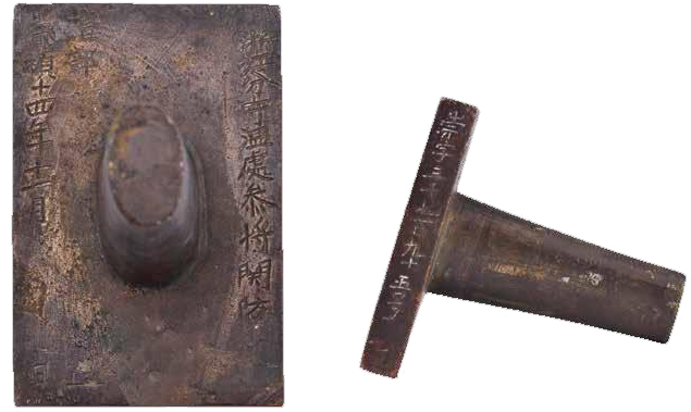 长方形,背面中部有椭圆形柄。印面四周边缘较宽,缘内铸篆书阳文汉字,分列两直行,每行五字,顺读为“浙江分守温处参将关防”。背面右边刻楷书“浙江分守温处参将关防”,左边二行,一行刻“礼部造”三字,一行刻“崇祯十四年十一月□(□为缺失文字)日”。右长侧面刻“案字三千七百九十五号”。是一枚明代铜官印。