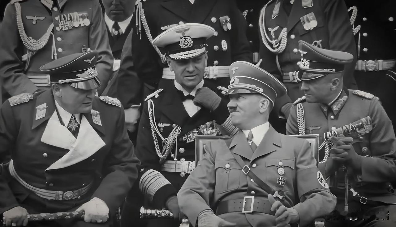 希特勒和他的三军元帅,从左至右依次为:赫尔曼·戈林、海军元帅埃里希·雷德尔、德国总理阿道夫·希特勒(1889-1945)和陆军元帅瓦尔特·冯·布劳希奇,他们在1939年4月20日于德国柏林举行的希特勒50岁生日阅兵式上坐在元首包厢内。