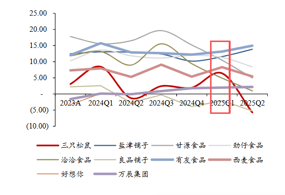 对于近五年毛利率持续下滑的原因,盐津铺子在2025年上半年的业绩说明会上表示,毛利率走低受到三重因素的影响。其中点名量贩零食渠道,强调此类新兴渠道以高周转、高效率、较低零售价格的特性获得消费者欢迎;且此类渠道的零售价格较低,导致公司毛利率有所下降。