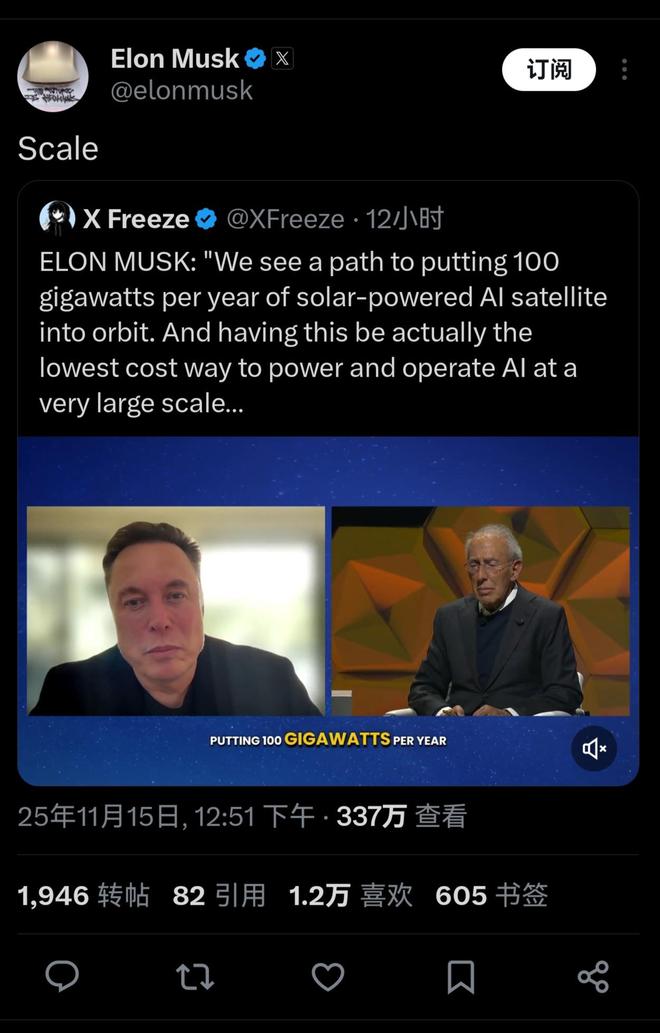 美国当地时间11月14日,马斯克在X上转发了一位网友分享的他最近接受罗恩·巴伦采访的视频。马斯克在采访中说:“我们看到了一条可行的路径,能够每年将100吉瓦的太阳能驱动的人工智能卫星送入轨道。而且这种方式实际上能够以最低的成本大规模驱动并运行人工智能。”