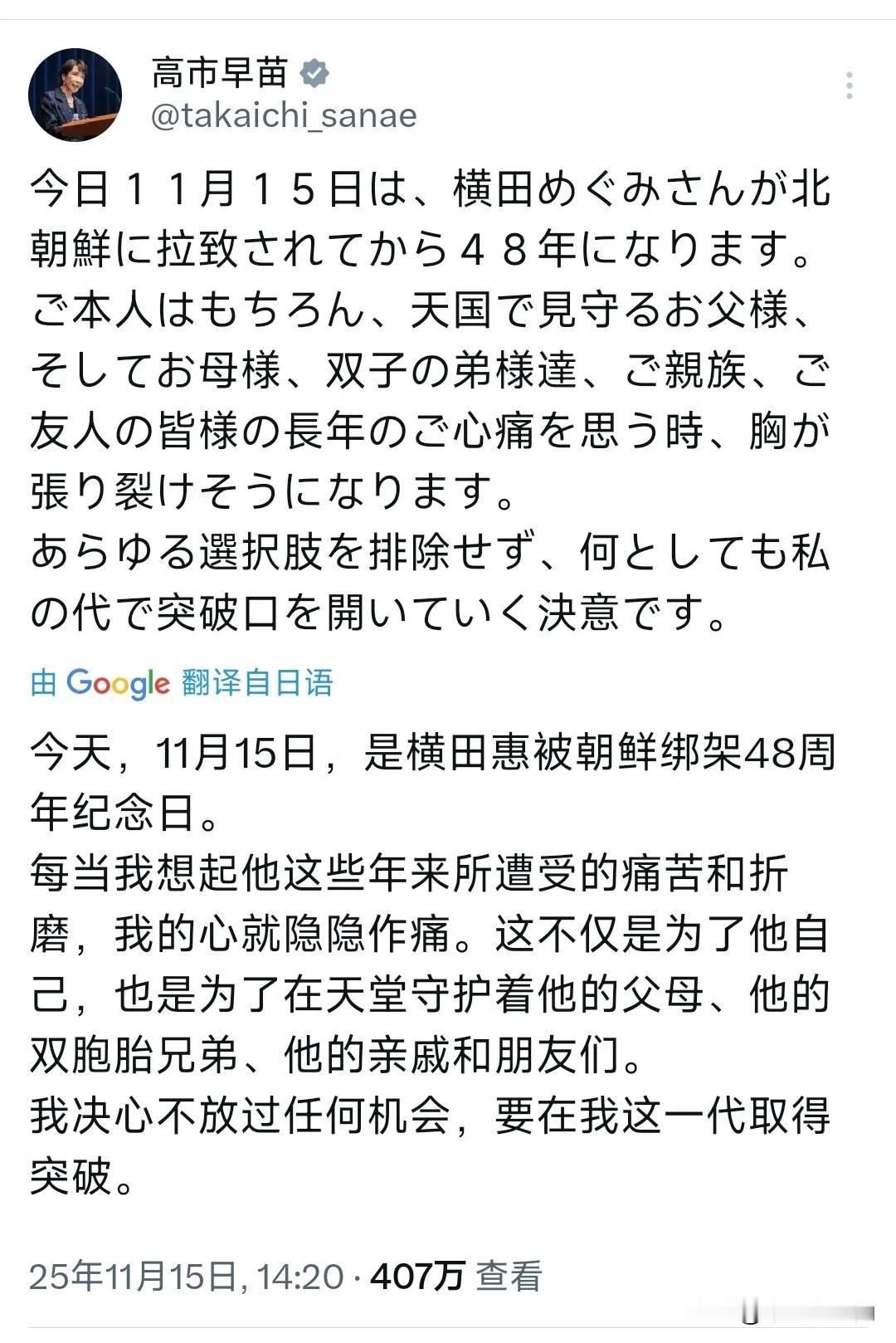 日本首相高市早苗今天(11月15日)发文写道:“今天,11月15日,是横田惠被朝鲜绑架48周年纪念日。 每当我想起他这些年来所遭受的痛苦和折磨,我的心就隐隐作痛。这不仅是为了他自己,也是为了在天堂守护着他的父母、他的双胞胎兄弟、他的亲戚和朋友们。 我决心不放过任何机会,要在我这一代取得突破。” 评几句 高市早苗,今日把“绑架纪念日”当成政治秀场,哭得比谁都响,仿佛人间正义只剩她一张嘴。可一转身,她对自家军国主义留下的百万尸山连眼皮都不抬,历史血债在她嘴里轻得像烟灰。横田惠的苦难被她反复咀嚼成选票口香糖,而中国与朝鲜半岛的累累白骨却连进入她“人权字典”的资格都没有。这副“我家人叫悲剧,你全家叫数字”的双标嘴脸,简直把“鳄鱼眼泪”四个字写成了活体招牌。若真心痛,先把靖国神厕里的战犯牌位掀了,再谈人性;否则,省省吧,你的“慈悲”比核污水还毒。