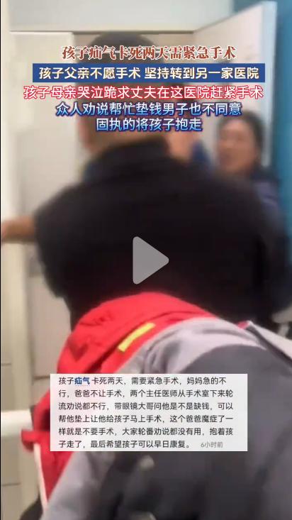 孩子疝气卡死疼了两天,需要紧急手术,父亲做的决定让人傻眼 事情起因是,孩子疝气卡疼了足足两天,医生建议紧急手术,可医生不论怎么解释疝气卡死超过4小时可能肠坏死,手术哪怕有风险依然应当手术。可是孩子的父亲竟然仍然坚持抱起孩子转身就走,不愿意手术。 孩子身体健康没有“侥幸”,专业医疗建议容不得固执。哪怕疝气是一个小问题,及时治疗可以很简单解决,但是已经卡死的情况相当危险,这个时候就应当听取医生的建议。为人父母可以谨慎,但不能让顾虑变成伤害,及时止损才是对孩子最大的负责。 孩子疝气危急 父亲拒绝手术 健康