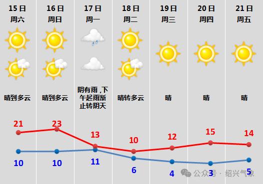 今天(11月15日),晨间绍兴局部地区有薄雾,白天阳光全程在线,无云层干扰。预计最高气温在21℃上下。