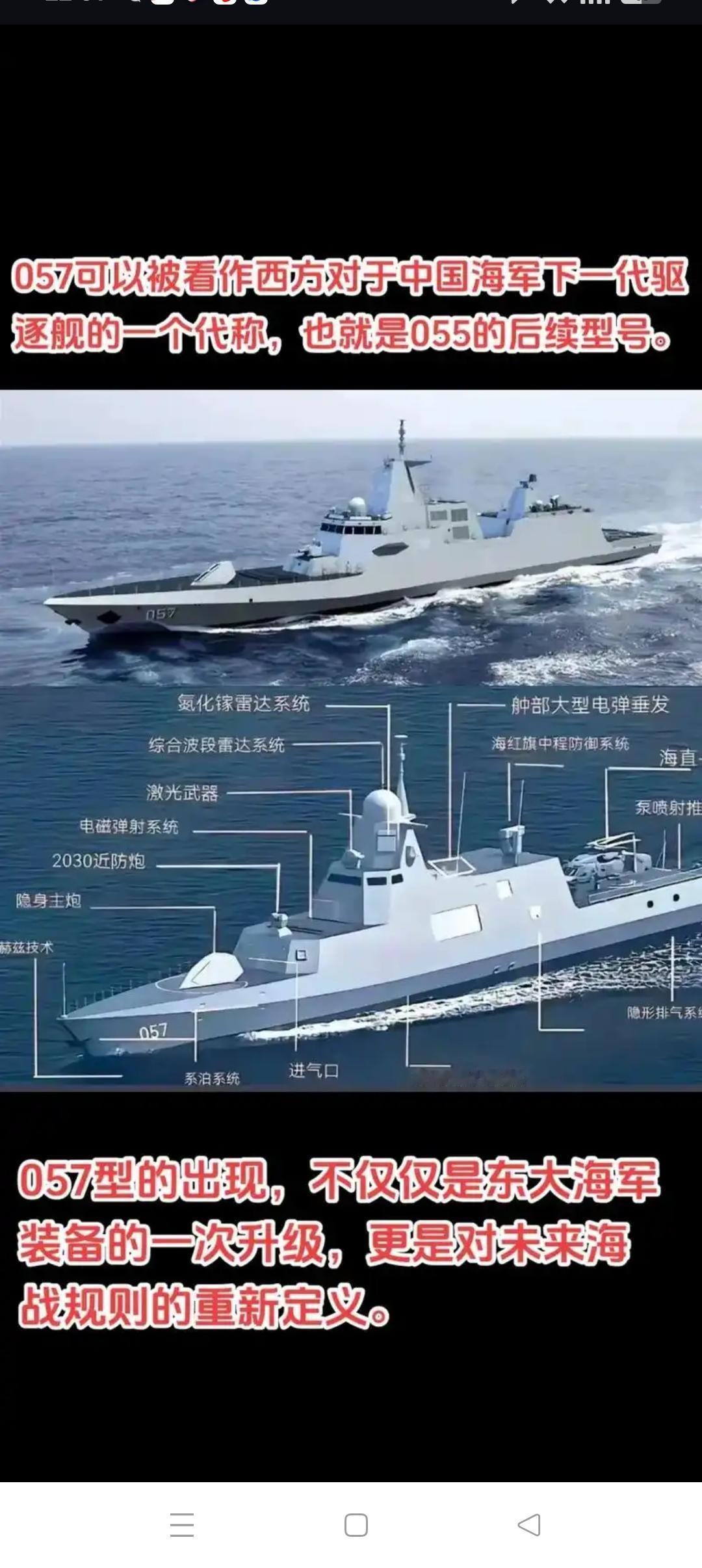 前进中的中国海军驱护舰队 目前现役的海军驱护舰队主要由056(50艘)、054A(50艘)、054B(2艘)护卫舰和052D(39艘)、055驱逐舰(14艘)、改造升级后的现代级驱逐舰(4艘)组成。其后,中国海军将研制排水量为9000吨的通用驱逐舰及排水量为20000吨的057大驱。一旦装备成军,中国海军驱护舰队的实力将更上一个台阶!