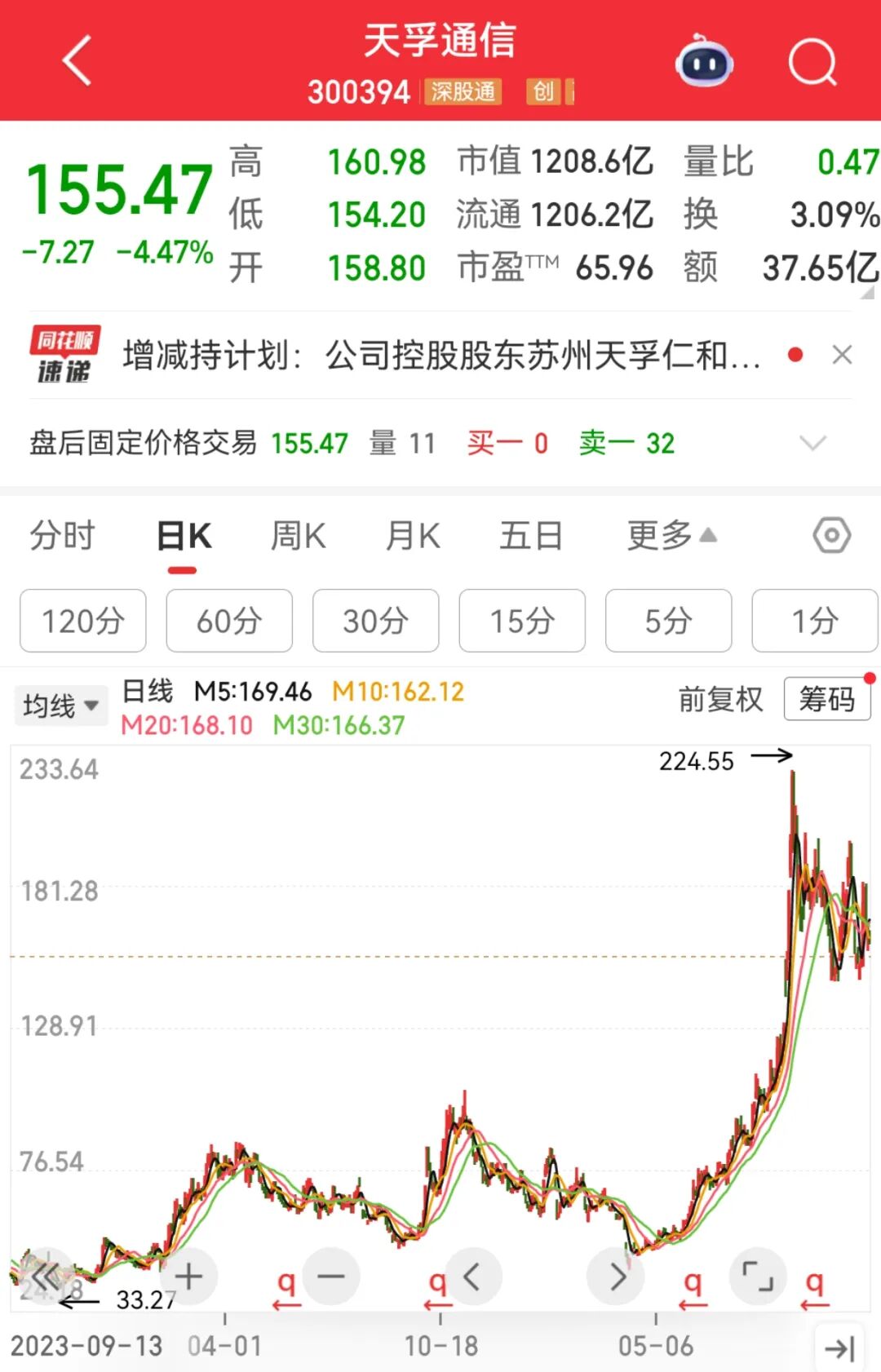 公司股价从年内39.94元/股的低点一度涨至224.55元/股(均为前复权),11月14日收报155.47元/股。