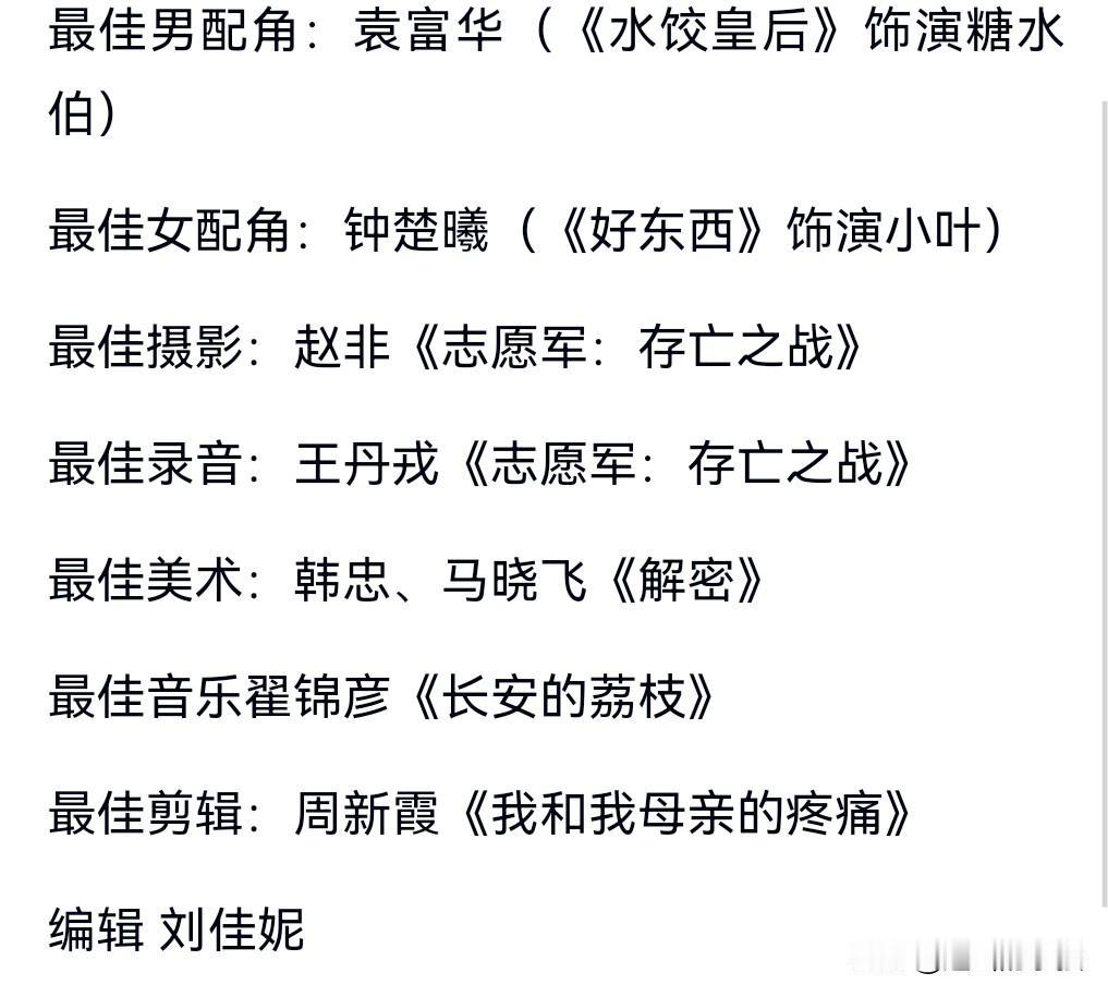11月15日。 金鸡奖完整获奖名单公布。 我最有印象的还是最佳男女主角。 最佳男主角颁给了易烊千玺,最佳女主角分给了宋佳。 得了这个奖,那意味着接下来的剧本会收到不少。 名利场就是这样。 易烊千玺这么年轻,就得了最佳男主角。 未来在电影方面的的成就不可限量。