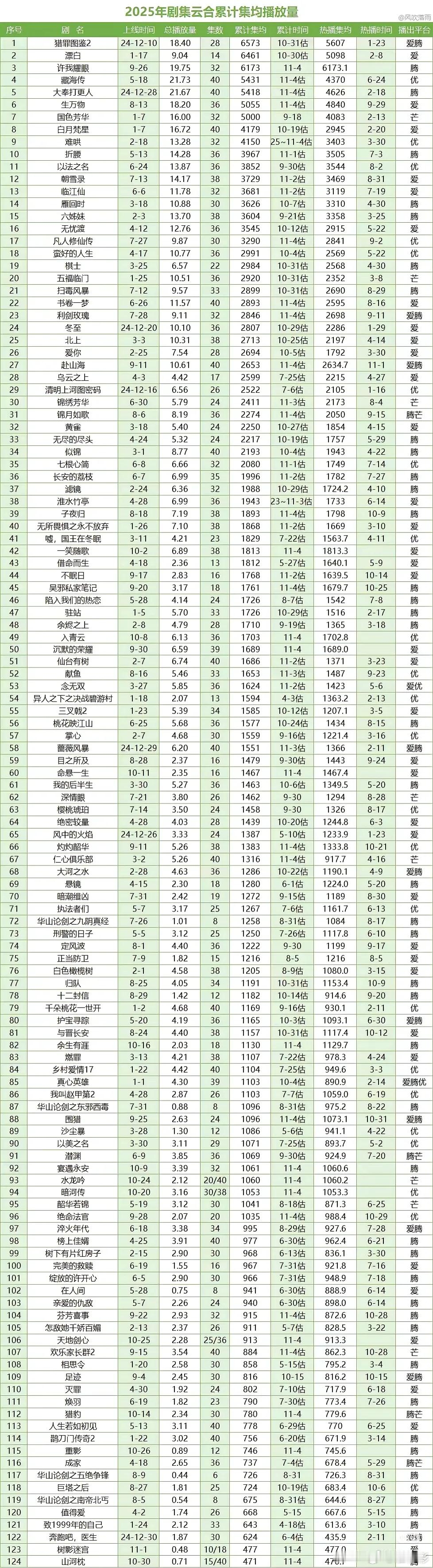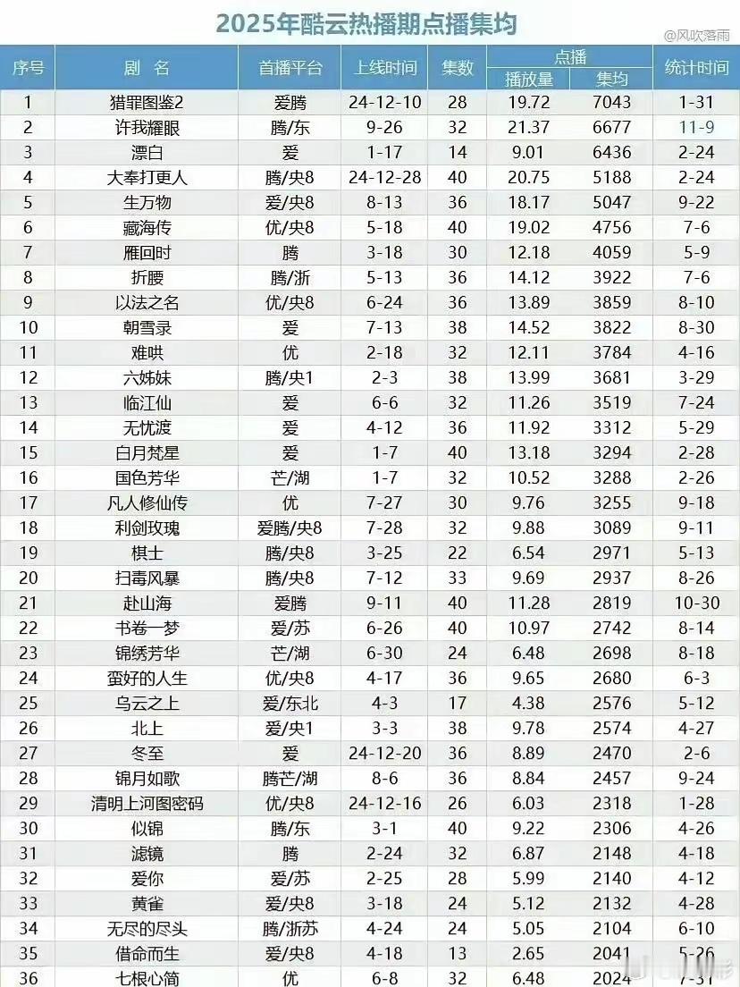 2025云合,酷云,集均前十排名!总年冠:《许我耀眼》联播年冠:《猎罪图鉴2》优酷年冠:《藏海传》腾讯年冠:《许我耀眼》爱奇艺年冠:《漂白》芒果年冠:《国色芳华》一月冠军:🐧🥝《猎罪图鉴2》二月冠军:👖《难哄》三月冠军:🐧《雁回时》四月冠军:🥝《无忧渡》五月冠军:👖《藏海传》六月冠军:👖《以法之名》七月冠军:🥝《朝雪录》八月冠军:🥝《生万物》九月冠军:🐧《许我耀眼》云合前十名分别是《许我耀眼》《猎罪图鉴2》《漂白》《生万物》《大奉打更人》《藏海传》《国色芳华》《以法之名》《折腰》《难哄》!酷云前十名分别是《猎罪图鉴2》《许我耀眼》《漂白》《大奉打更人》《生万物》《藏海传》《雁回时》《折腰》《依法之名》《朝雪录》你都看过哪一部?这个榜单是云合官方榜单,有人会质疑,集数不同,开播时间不同,确实是这样,但如果看集均,那也存在,各平台日活差异,上星与网剧的差异,热播期差异,其实都会存在争议,所以各个榜单都看看没错的。总之能进去年榜前十的肯定都是播的特别出色的剧。感觉今年整体剧集表现是比去年好的,制作精良的剧很多!