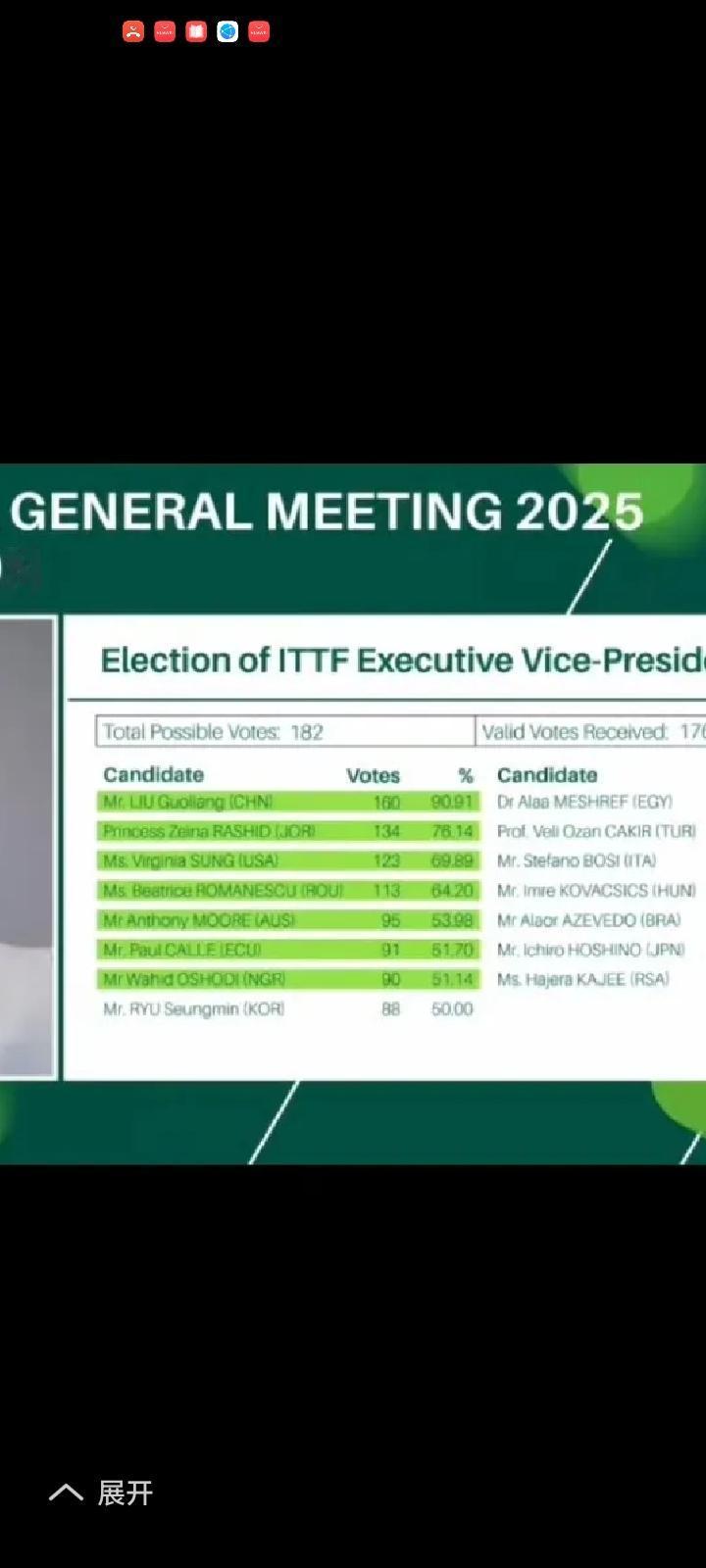 11月15日国际乒联执行董事会选举,恭喜刘国梁选票第一入选董事会[赞][赞][赞]世界乒乓球项目有今天的发展和辉煌,离不开刘国梁的大智慧,大格局的付出和共献,继续发展下去也离不开他的引领指导,相信他会不负众望,尽其所能带领全世界热爱乒乓球的人,让乒乓球项目越来越好。加油加油。