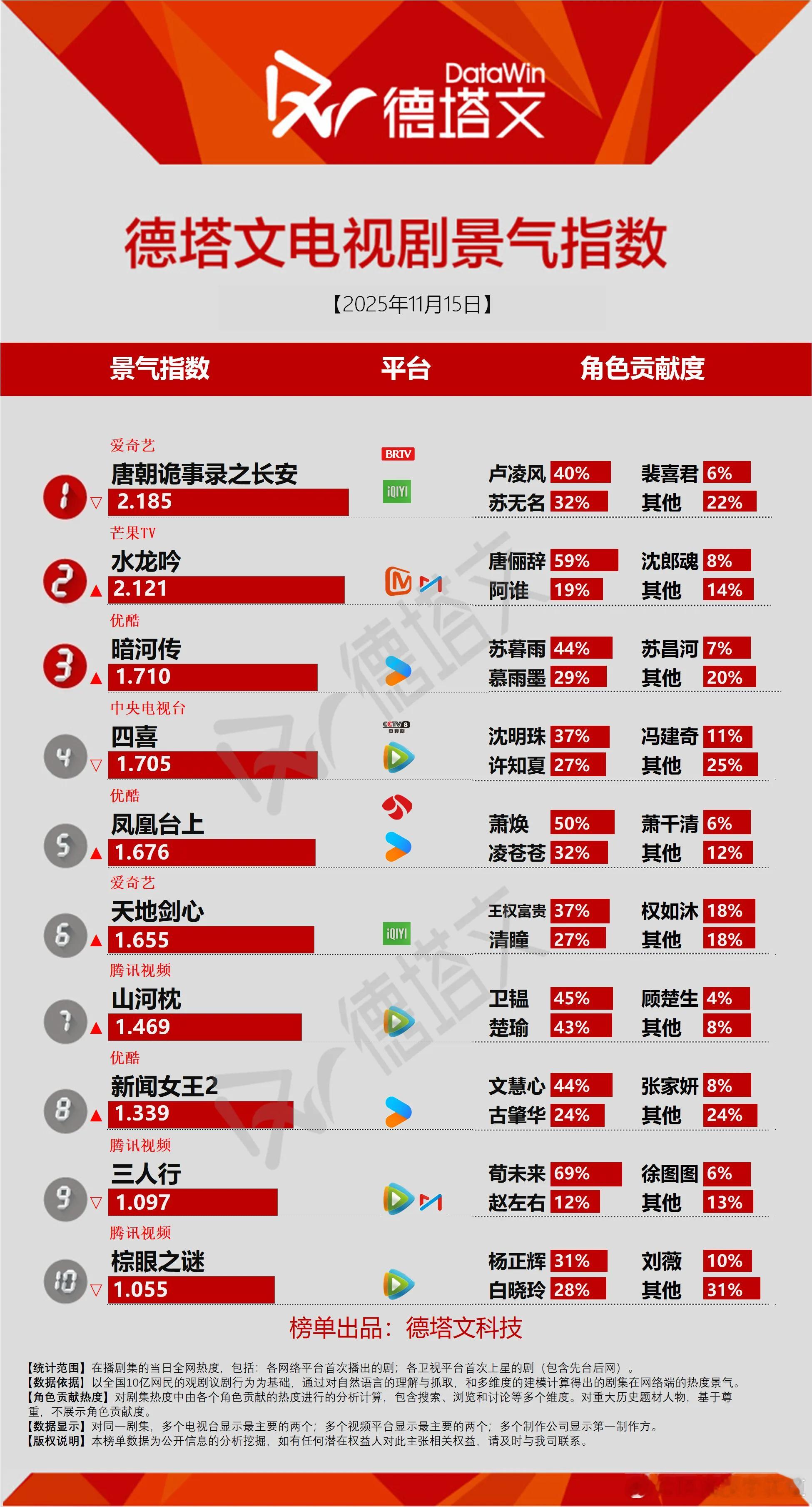 11月15日德塔文景气指数唐诡3 2.185讨论度不够,这季的案子讨论的人都跑哪去了?水龙吟2.121这部剧其实看历年数据,还是播得不错的,就看和谁对标,不要自己为难自己,设置障碍。暗河传1.710口碑不错的剧,数据下降的都比较慢,说明剧情挺住了。四喜1.705看切片真的狗血无语,这年头还要给人写死。凤凰台上1.676没什么宣发的情况下,任嘉伦这部分手剧其实效果还不错的。