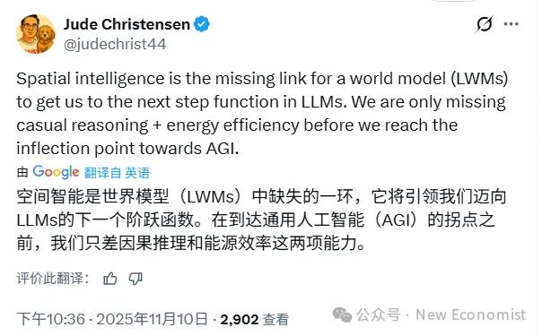 空间智能是世界模型中缺失的一环,它将推动LLM的能力实现一次巨大飞跃,只要因果推理能力和能效达到相应水平,我们就将站在通往AGI的拐点上。