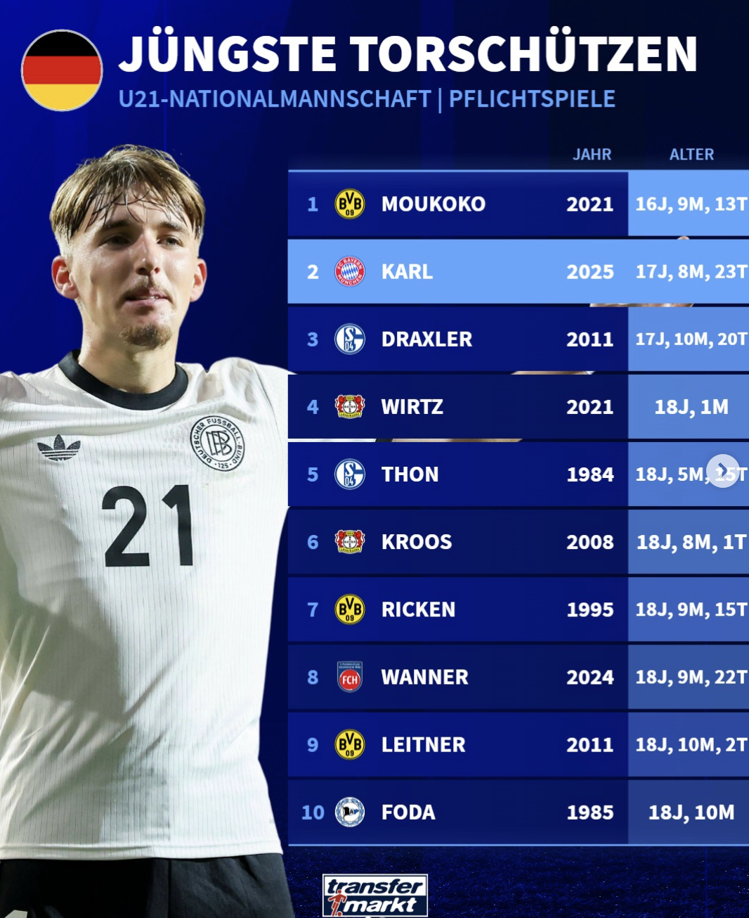 虎扑11月15日讯德转统计了德国U21国家队最年轻进球球员榜。