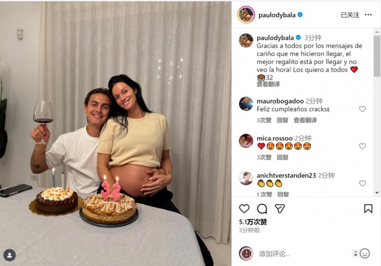 迪巴拉社媒晒出与怀孕妻子一起庆祝的合照,配文:“感谢大家的生日祝福,最棒的礼物即将到来,我已迫不及待!爱你们所有人。”