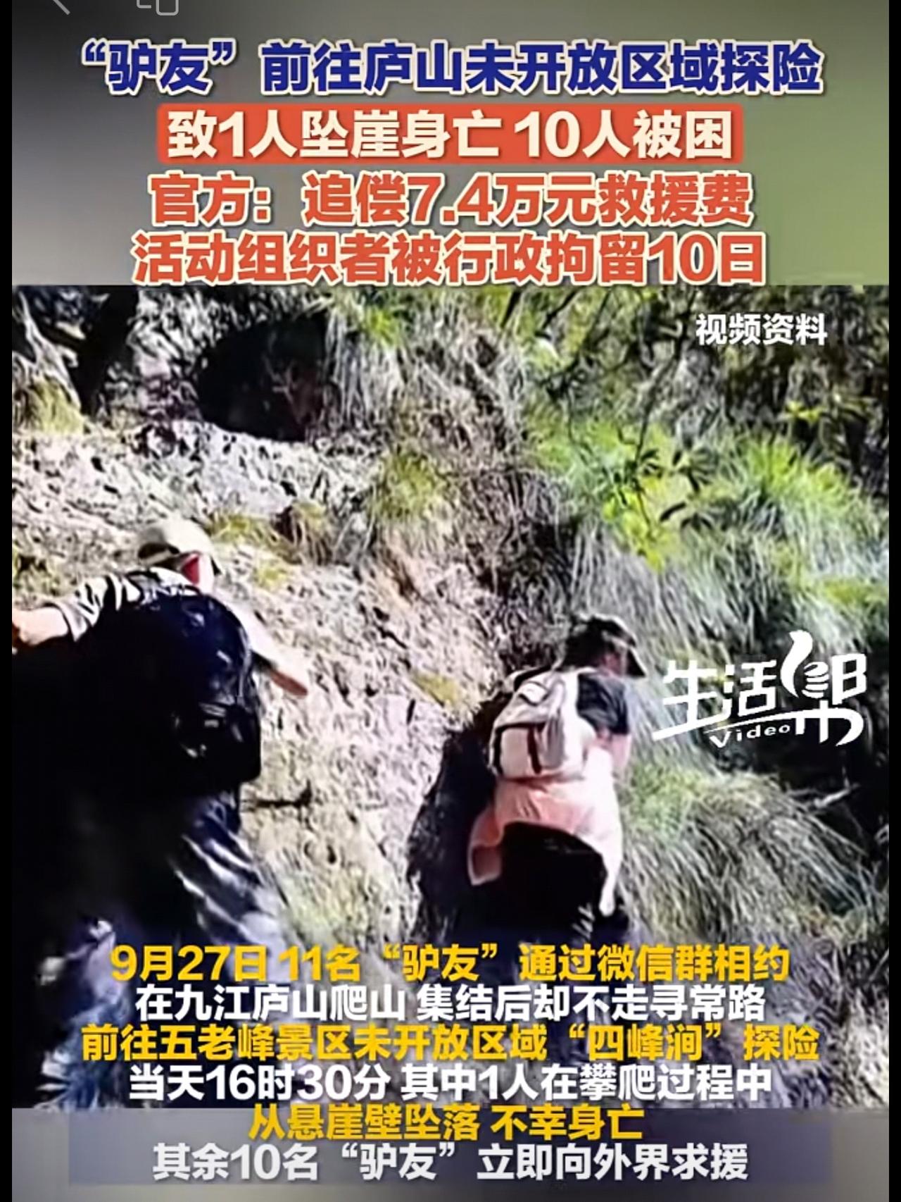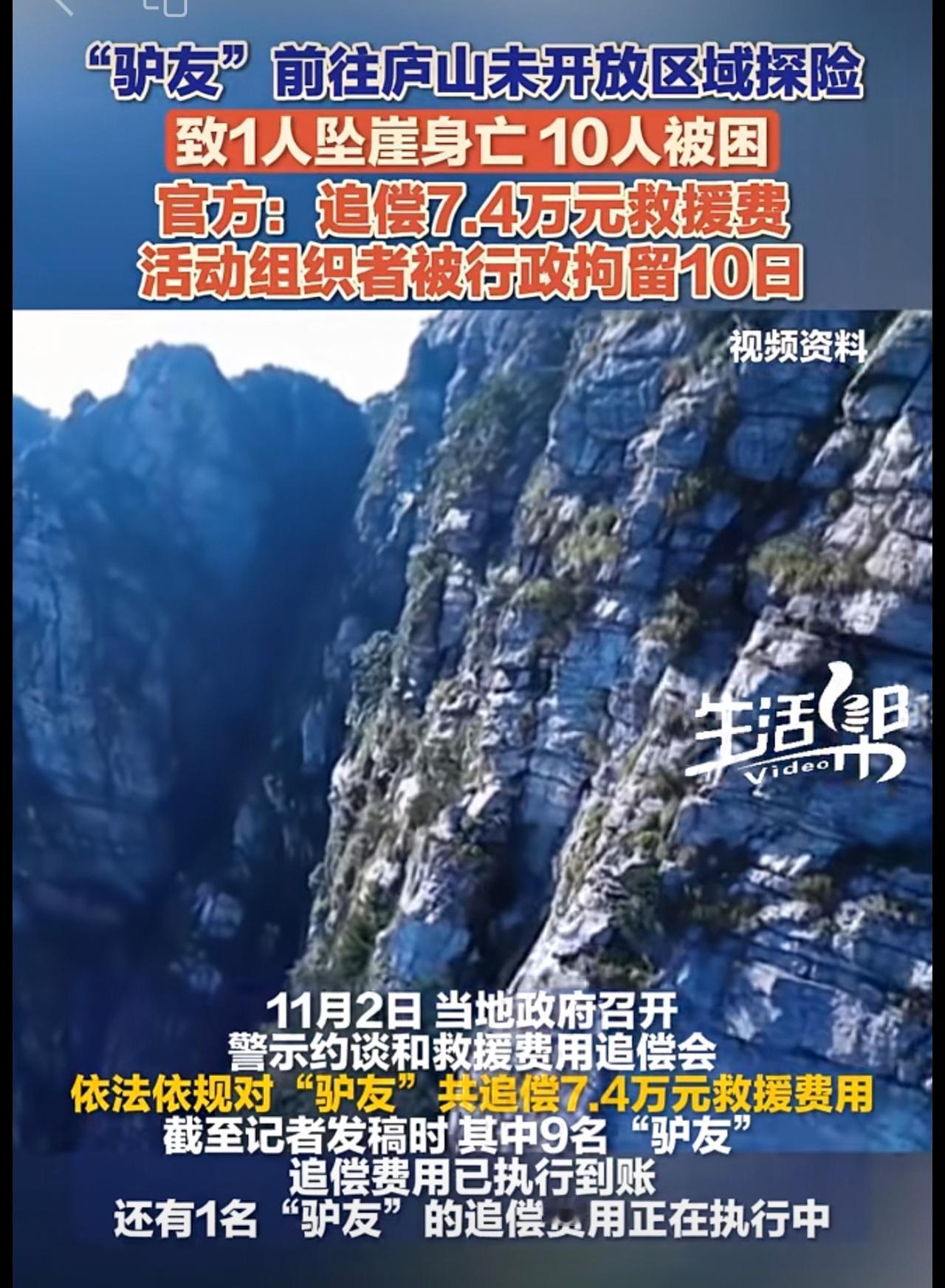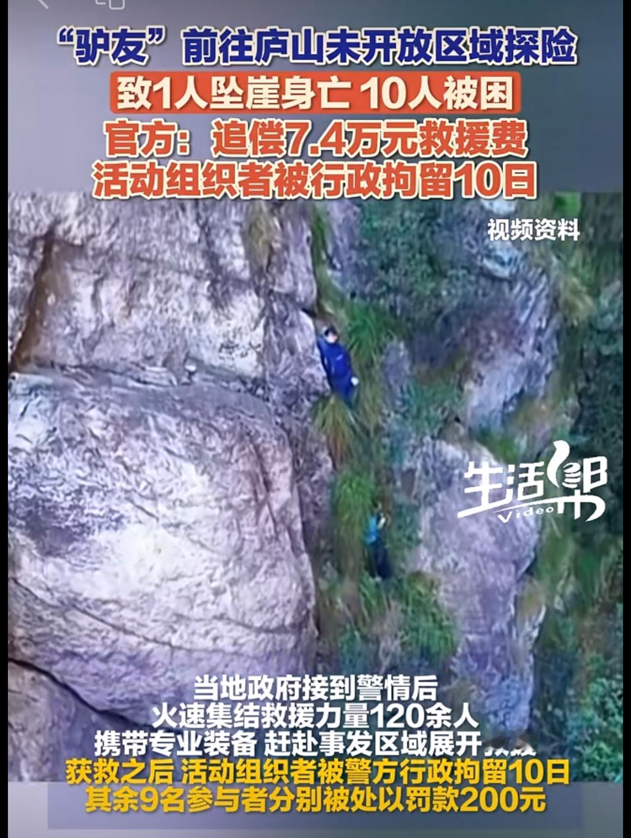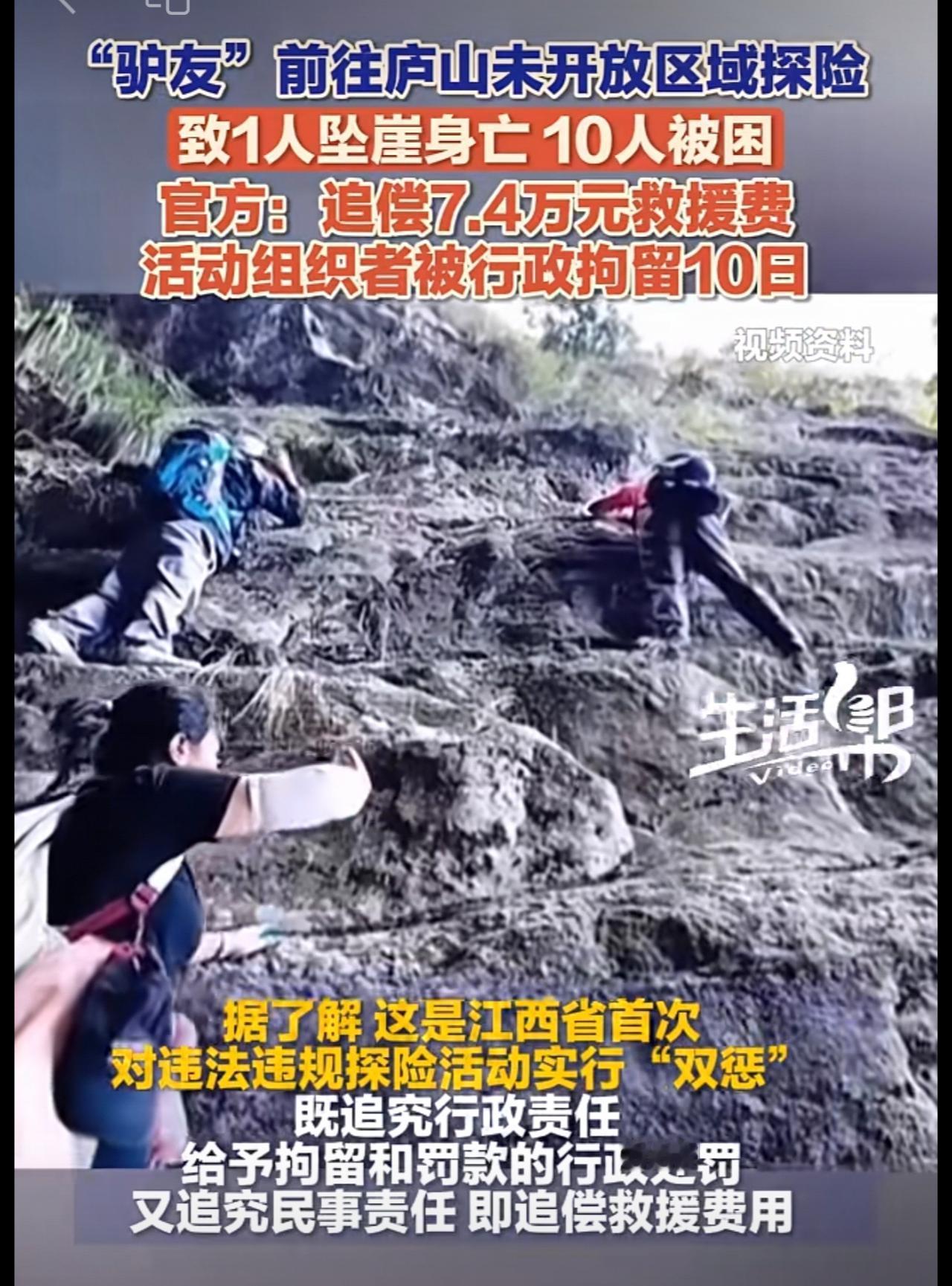 11名“驴友”前往庐山未开放区域探险,致1人坠亡、10人被困。当地政府依法依规对被困“驴友”追偿7.4万元救援费用。此前,该野游活动组织者已被行政拘留10日。(山东广播电视台生活帮)