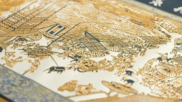 徐徐展开这幅剪纸长卷,北宋市井百态跃然纸上:八百余个人物神态迥异、栩栩如生,车马行人络绎不绝;酒楼、茶馆、当铺等建筑错落有致,船上钉铆纹路清晰,店铺招牌的书法字迹更透着笔墨神韵,让人仿佛穿越千年时光,置身汴京的繁华街头。
