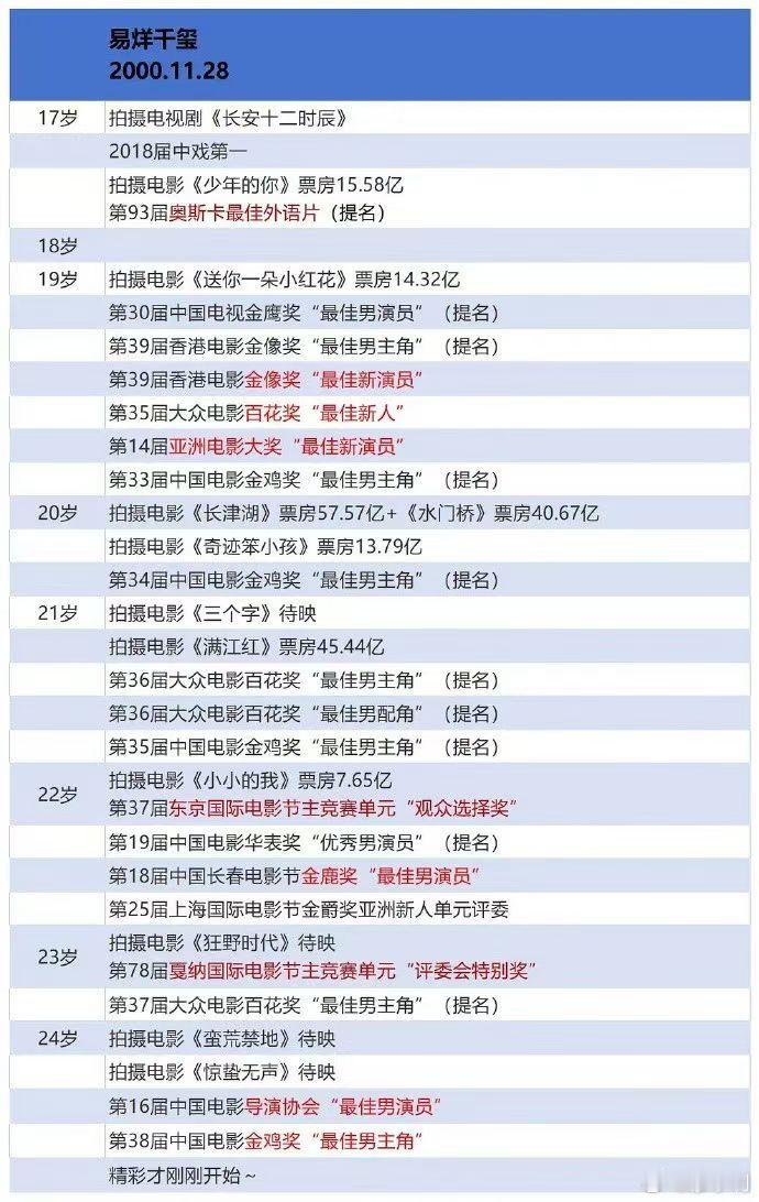 易烊千玺成为了最年轻影帝,以24岁11个月打破刘烨26岁获影帝的纪录。看易烊千玺这人生履历,简直一路开挂,在这么年轻的年纪就达到别人一辈子都达不到的高度!