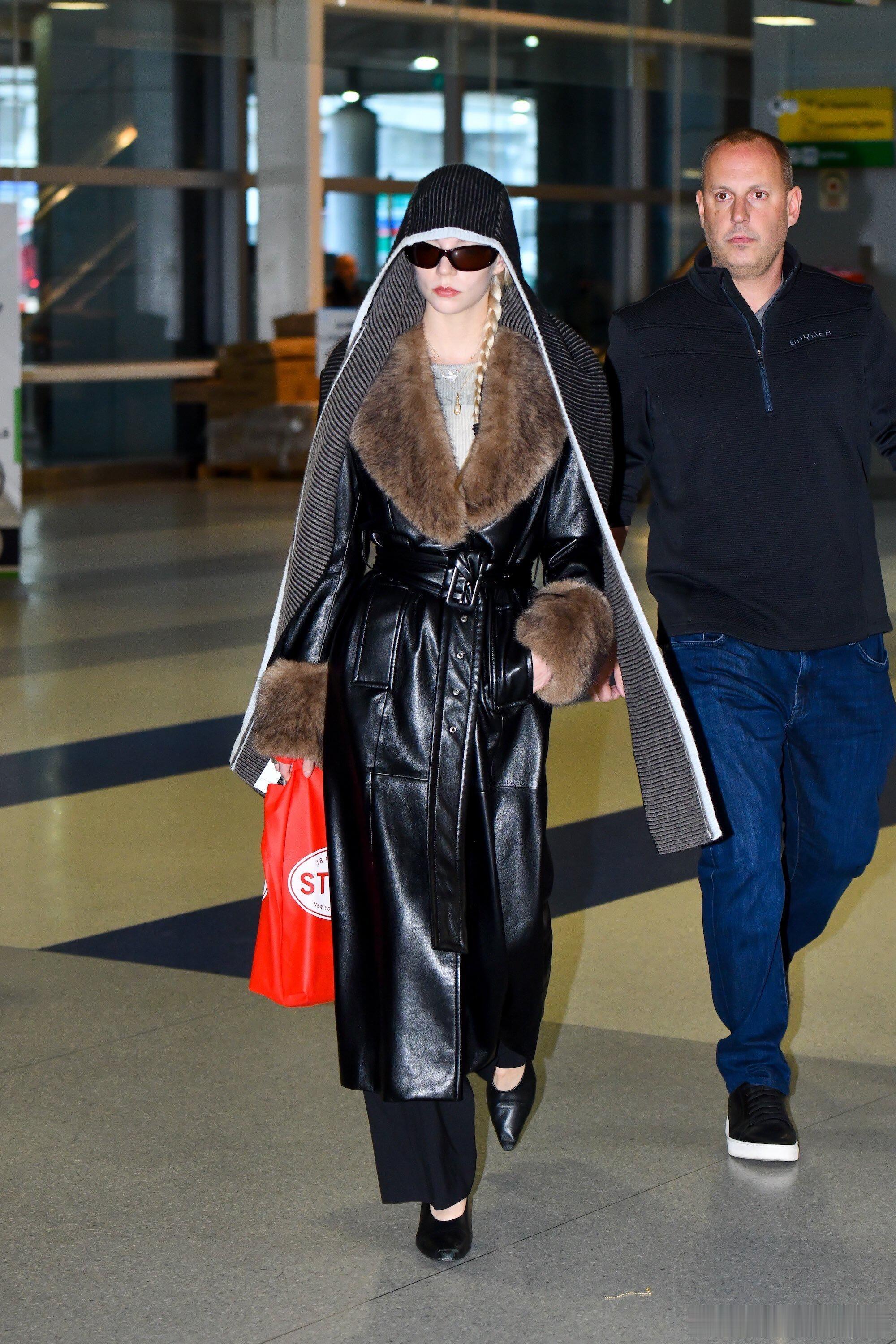 安雅最新机场look,在皮草皮外套上搭了Eckhaus Latta “Huddl