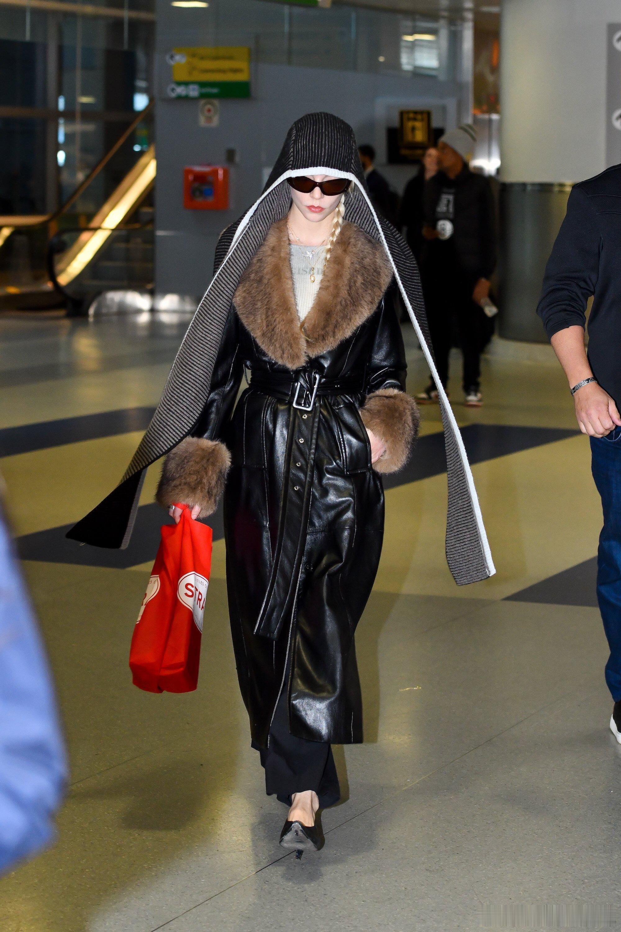 安雅最新机场look,在皮草皮外套上搭了Eckhaus Latta “Huddle Bonnet!” ,有趣