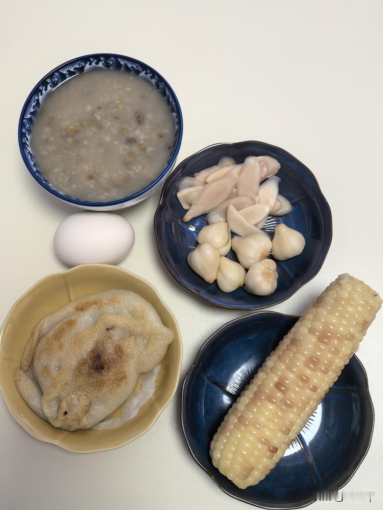 早餐,会不会多了点呢? 绿豆粥,客家萝卜粄,糯玉米,鸡蛋🥚,苹果醋仔姜和腌蒜头。 记录生活,随手拍张照