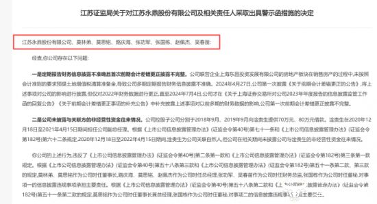 2024年12月,永鼎股份公告,公司收到江苏证监局关于对公司及相关责任人采取出具警示函措施的决定。报告显示公司存在定期报告财务信息披露不准确且首次前期会计差错更正披露不完整的问题,莫林弟、莫思铭作为公司时任董事长,路庆海、莫思铭、赵佩杰作为公司时任总经理,张功军、吴春苗作为公司时任财务总监,张国栋作为公司时任董秘,对信息披露违规事项承担主要责任。
