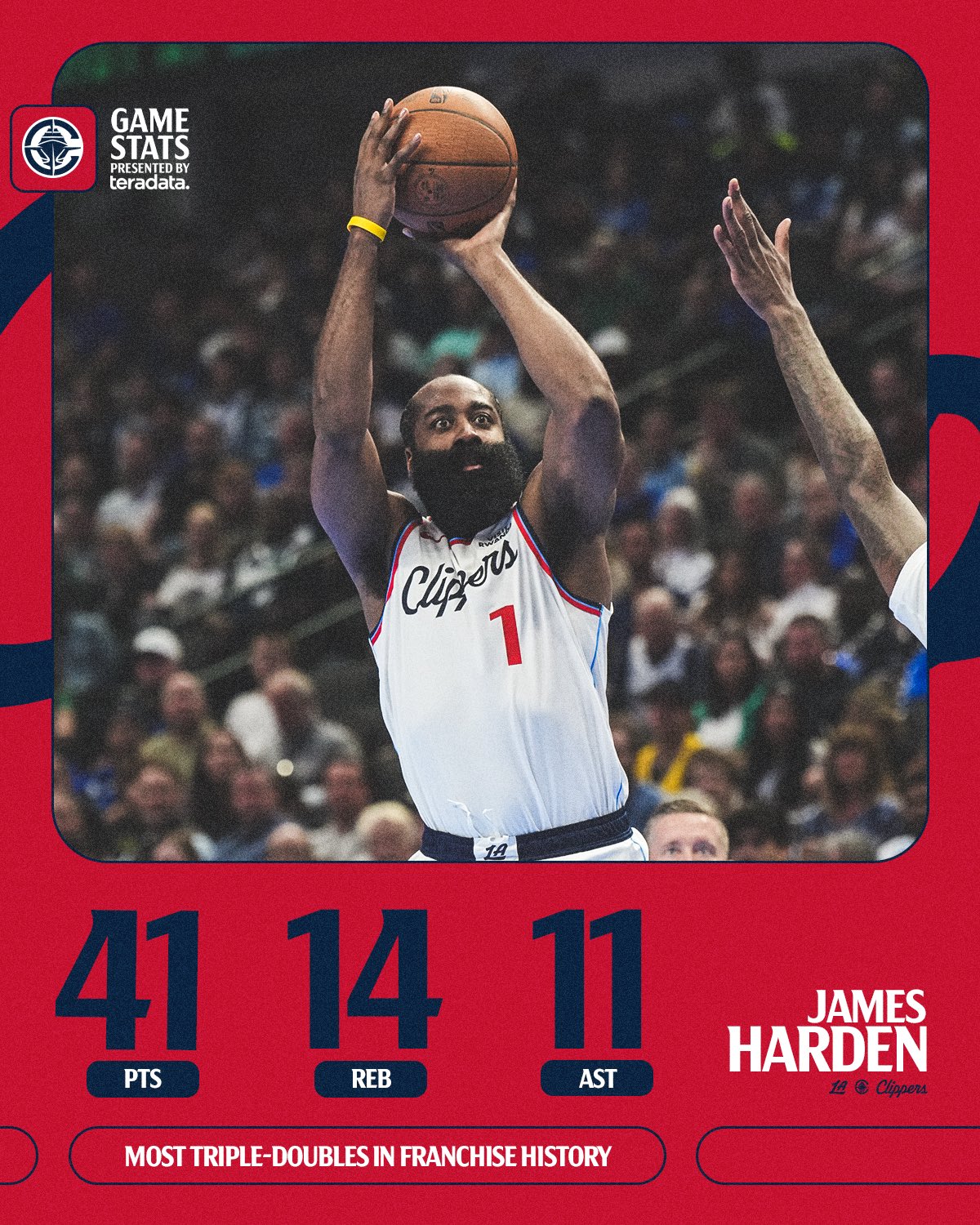 今日,快船社媒晒出詹姆斯-哈登本场比赛的个人数据海报,并配文: