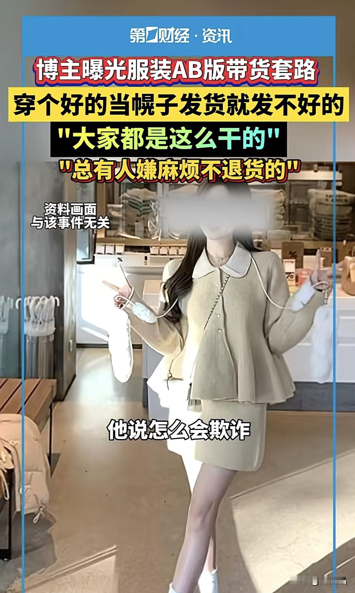一边喊买家退货率高,一边干着欺诈消费者的事!真的搬起石头砸自己的脚。 一博主曝光电商AB版带货套路,电商主播穿着质量好的衣服展示销售,挂链接和发货却是质量差的衣服。 博主:“你这么做不是欺诈消费者吗?” 商家:“这怎么会是欺诈呢?大家都是这么干的,总有人嫌麻烦不退货的” 博主:“那你们这么干没有处罚吗?” 商家:“没有” 这商家还认为自己不是欺诈,以次充好给消费者发货,货不对版妥妥的欺诈,这并非是图片色差,不是简单的买家秀和卖家秀的问题。 近日A4纸大的衣服标签、上锁的羽绒服冲上热搜,矛头直指素质低、无理由退货的消费者。电商服装退货率高并非全是经常无理由退货的消费者造成的,源头还是商家这种货不对版的行径,夸大宣传,严重失真的精修图导致消费者心理落差,退货率自然会居高不下。 我觉得,货不对版的事该管一管了,没有处罚,欺诈消费者成本太低了,商家甚至都觉得这样做没问题。商家真的搬起石头砸自己的招牌,贪图短期的利益,只做一次性买卖的生意做不长久。 网购产品套路 拆解带货直播间卖爆的营销套路