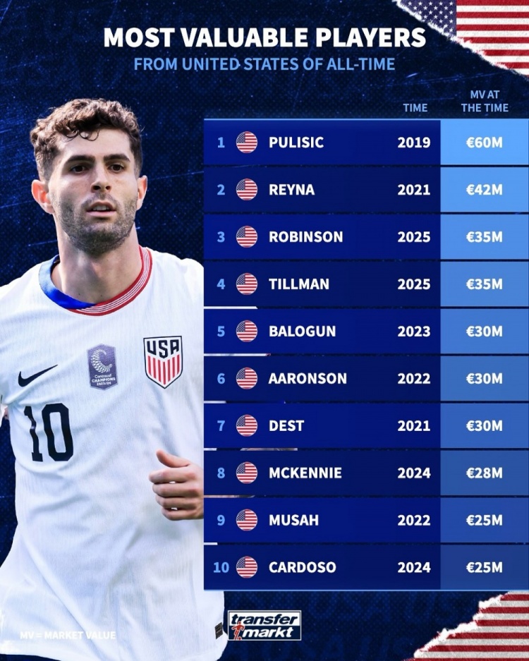 直播吧11月16日讯德国转会市场盘点了美国球员历史身价排名,2019年的普利西奇以6000万欧元排名第一。