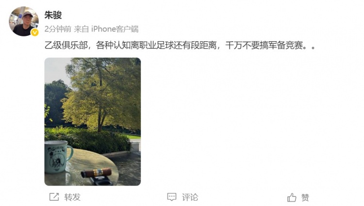 今天,朱骏在个人微博晒照,他同时配文:乙级俱乐部,各种认知离职业足球还有段距离,千万不要搞军备竞赛。。