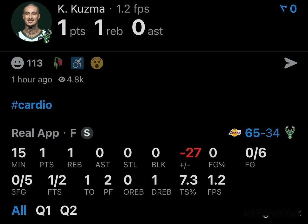 库兹马对湖人队是“真爱”啊! 今天,雄鹿队坐镇主场迎战湖人队,库兹马面对老东家,本以为他会全力以赴打出出色的表现,没想到却让人大失所望。 上半场结束,他6投0中,其中三分球5投0中没有运动战得分,仅靠罚球得到1分,正负值低至-27,球队也以34-65落后多达31分。只能说,库兹马对老东家湖人队绝对是“真爱”啊!