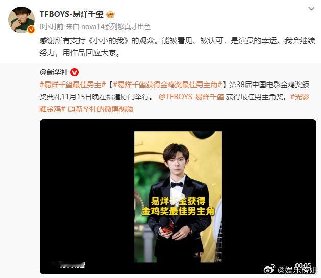 易烊千玺获得第38届金鸡奖最佳男主角,工作室回应:“多年来,路就是这样一步步踏出来的,也仍将稳着向远走。”,恭喜千玺,实至名归