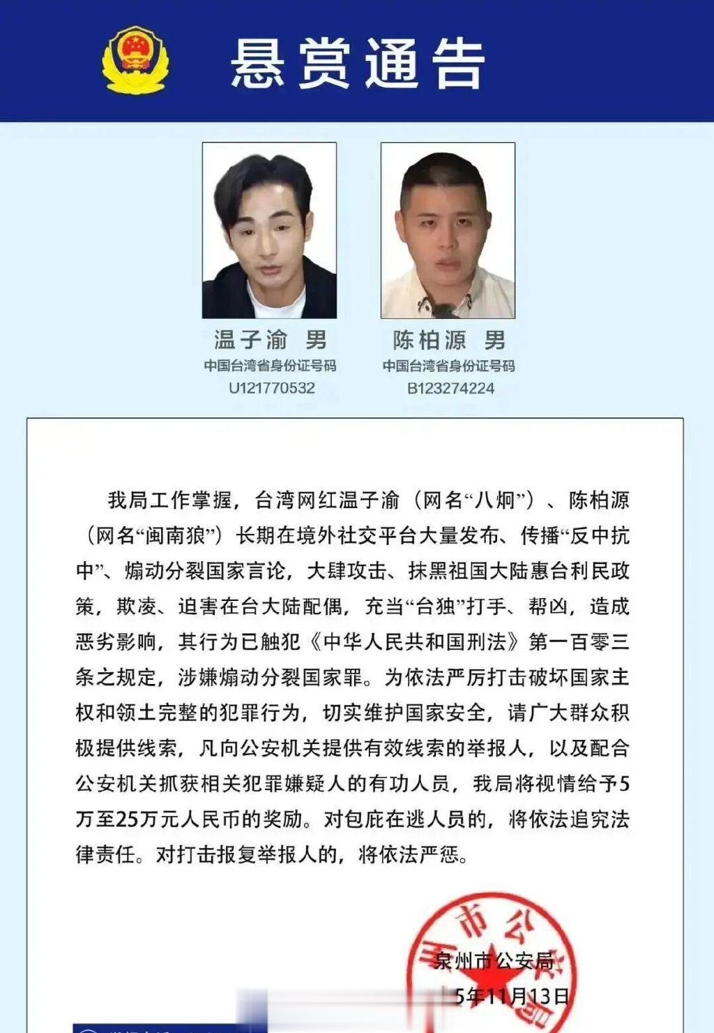 继10月28日重庆市公安局宣布对“台独”顽固分子沈伯洋以“分裂国家罪”立案侦查后,福建泉州市公安局11月13日也发布悬赏通告,征集台湾网红温子渝(网名“八炯”)、陈柏源(网名“闽南狼”)违法犯罪线索,代表大陆对于惩处“台独”分裂分子已正式进入常态化执法环节,尤其在针对少数“台独”顽固分子方面,正在起到积极正面的威慑作用。