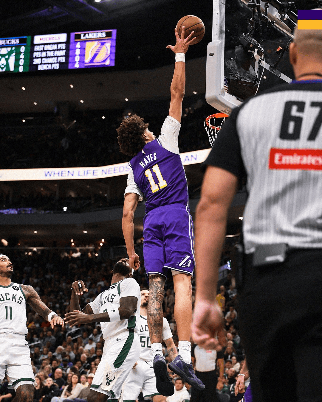 本场比赛,湖人球员贾克森-海斯全场出战16分钟,4中3得到10分6篮板2抢断,并贡献一己精彩的战斧劈扣。