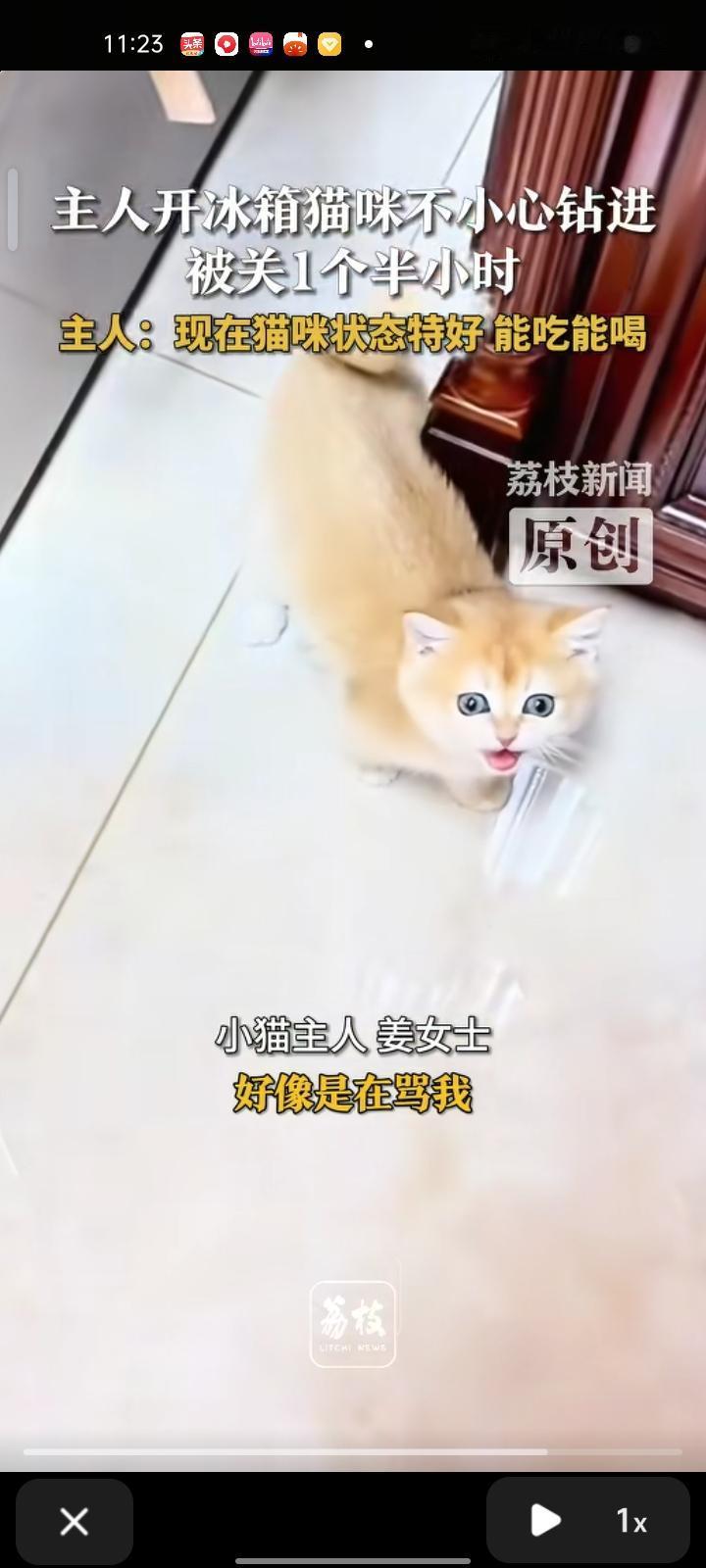 11月14日,吉林长春。女子开冰箱时猫咪不小心钻进,关冰箱后就下楼吃早饭,这才想起猫不见了,找遍一个小时没找到。翻监控才发现,自己关冰箱忘记猫咪在里面,现在猫咪被放出来了,状态很好,能吃能喝