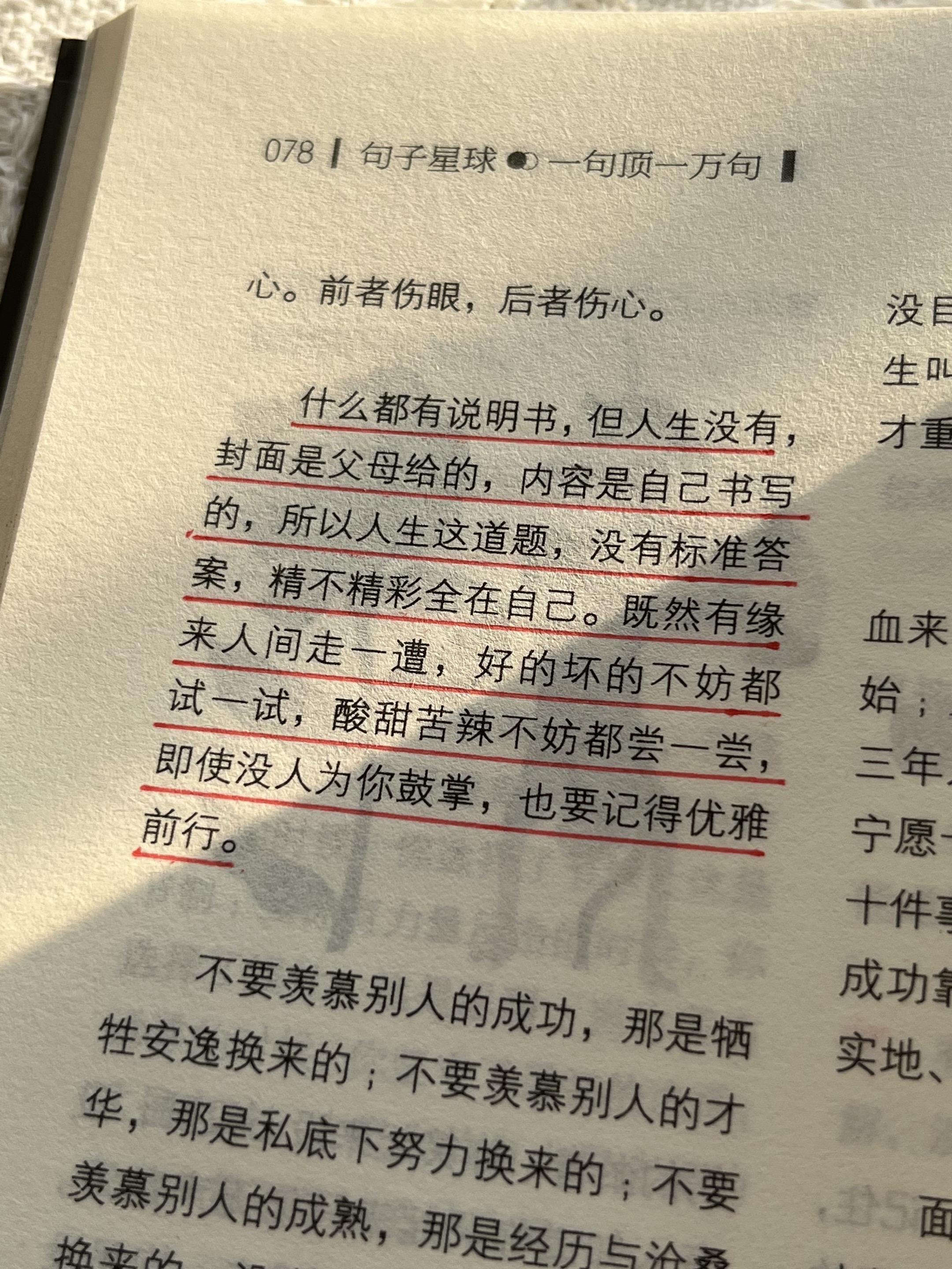 什么都有说明书,但人生没有,封面是父母给的,内容是自己书写的,所以人生这道题,没有标准答案,精不精彩全在自己。既然有缘来人间走一遭,好的坏的不妨都试一试,酸甜苦辣不妨都尝一尝,即使没人为你鼓掌,也要记得优雅前行。金句摘抄认知提升好书推荐