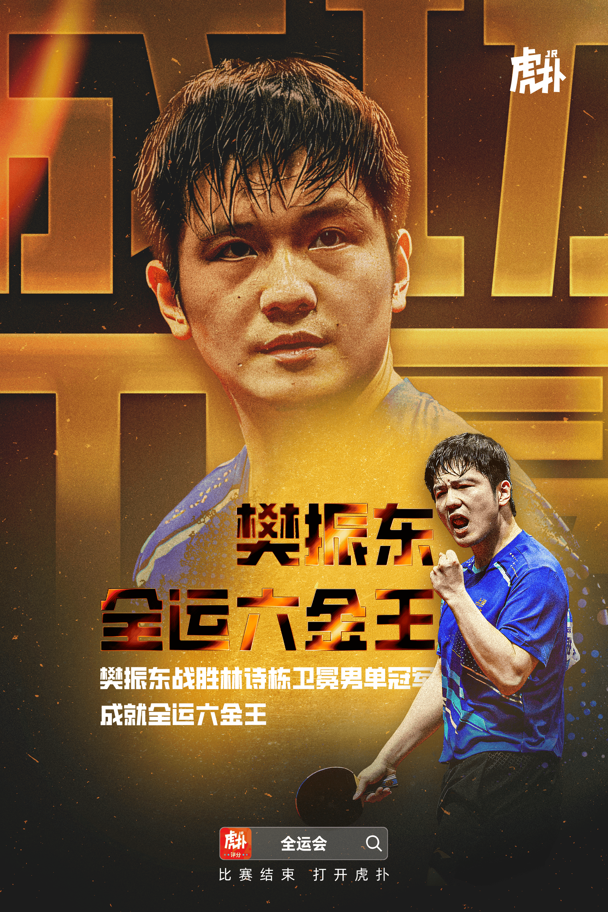 这是樊振东在全运会获得的第六枚金牌,也是他继2021年夺得全运会男单冠军后再次夺冠,他也成功实现了该项目的卫冕。