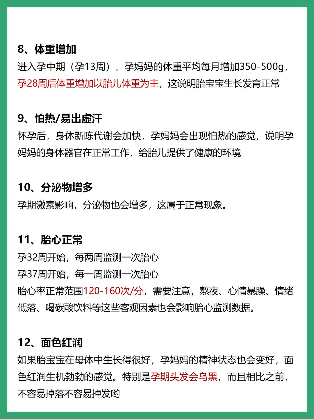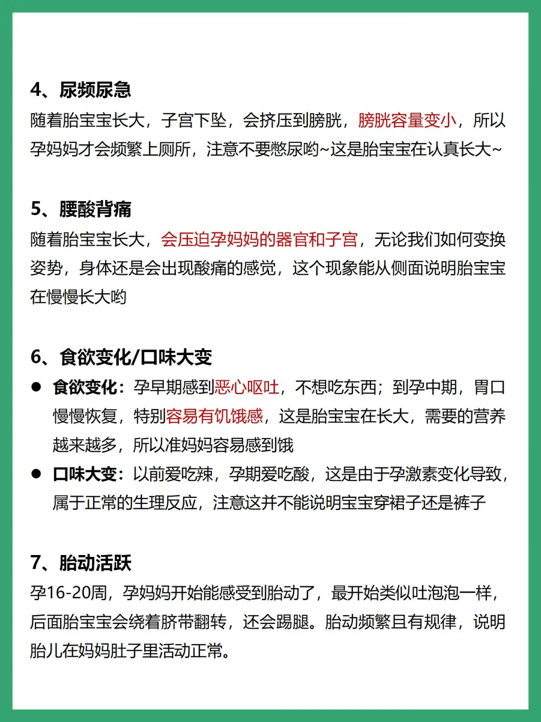 怀孕后,由于孕期激素影响,孕妈妈的身体需要一个适应过程,其间会出现孕反、嗜睡、腰酸背痛、耻骨痛、尿频等,这些都是身体正常反应哟~ · 怀孕这12个征兆,说明胎儿发育得很好 1、容易暴躁或容易低落 2、嗜睡 3、胸胀 4、尿频尿急 5、腰酸背痛 6、食欲变化/口味大变 7、胎动活跃 8、体重增加 9、怕热/易出虚汗 10、分泌物增多 11、胎心正常 12、面色红润不掉发 · 怀孕胎儿成长发育孕产知识怀孕那些事产检孕产知识怀孕日记胎儿成长发育胎儿发育孕期