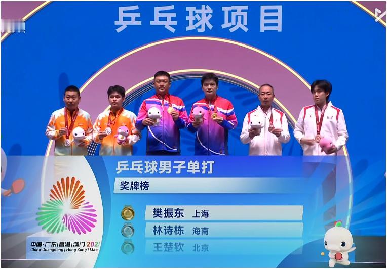 全运会乒乓球男单颁奖仪式。 金牌🥇得主:上海队樊振东。 银牌🥈得主:海南队林诗栋。 铜牌🥉得主:北京队王楚钦。 樊振东全运会单打总共2金2银,四次全运会男单全部打进决赛:2013年3-4输马龙、2017年2-4输马龙、2021年4-0刘丁硕、2025年4-1林诗栋。 银牌这是林诗栋的第一块奖牌。2021年林诗栋第一轮被刘丁硕淘汰。 铜牌是王楚钦第一块奖牌。2021年王楚钦是第四,半决赛输给了刘丁硕,铜牌赛输给了梁靖崑。