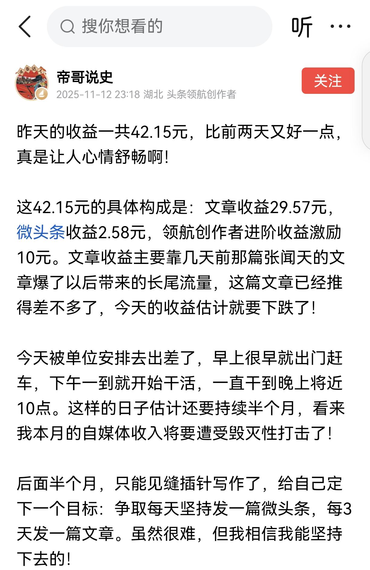 42.15元,比之前又涨了点,看着就舒心!作品来源于“帝哥说史。”文章收益能靠长尾流量持续发力,说明内容确实扎实,这挺厉害的。不过一想到要出差半个月,时间紧张得挤着写,确实替你捏把汗,但你还定下了坚持的小目标,这股韧劲儿值得佩服。 想让微头条涨收益,有个小干货:出差路上可以随手拍点身边事、记点小感悟,不用长篇大论,真实的生活片段反而容易拉近和读者的距离;另外,利用碎片时间回复评论,保持互动,能让账号更活跃,平台也会多给些流量,试试这样,说不定出差期间也能有小惊喜!