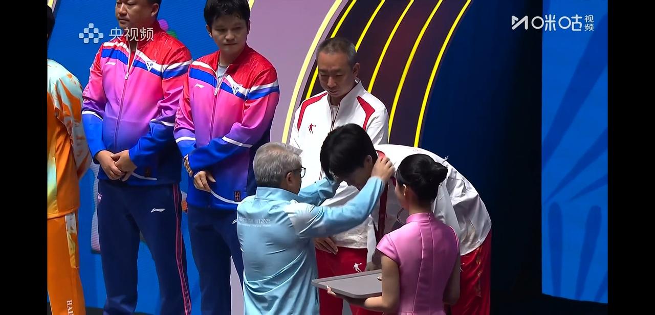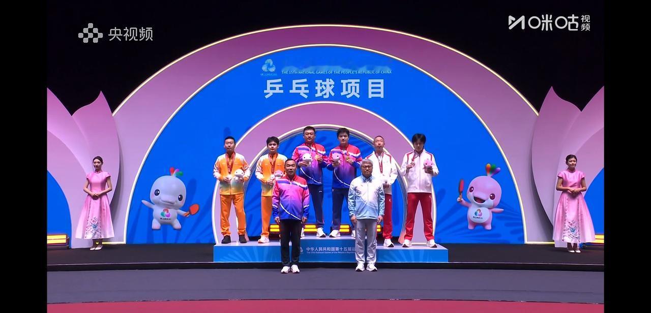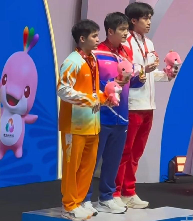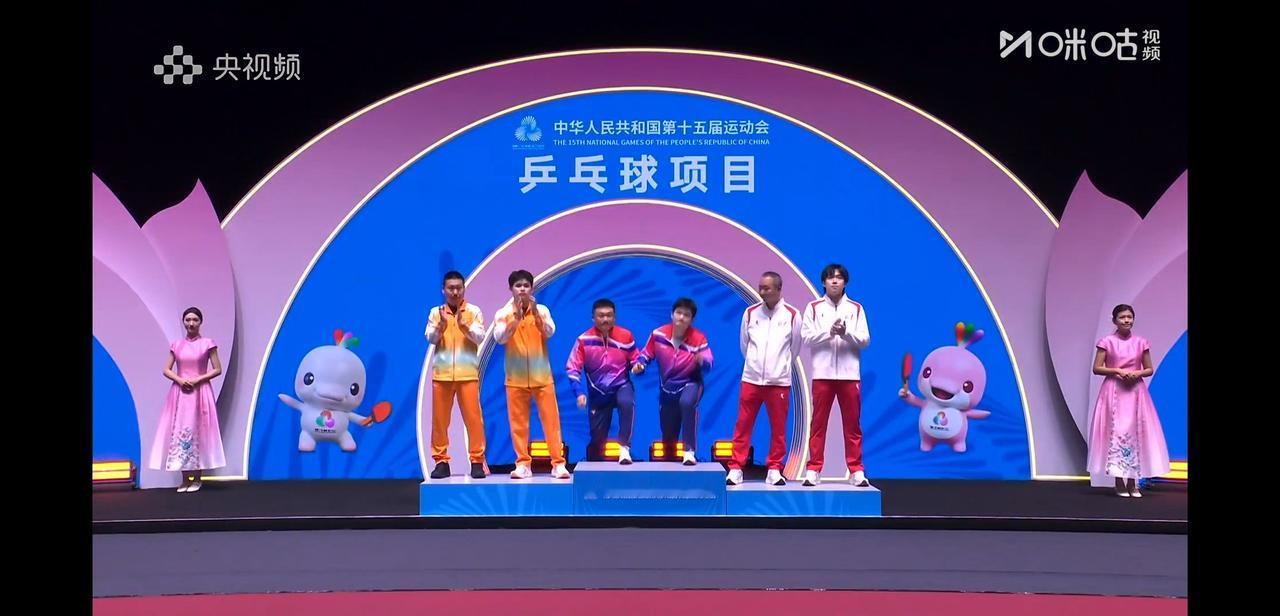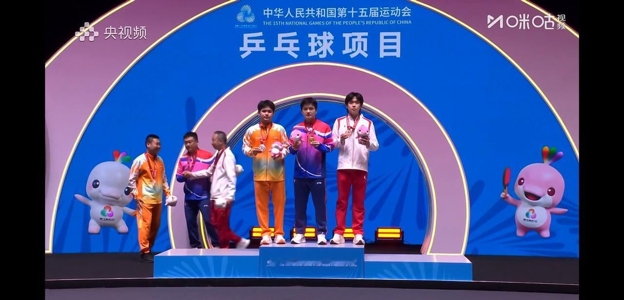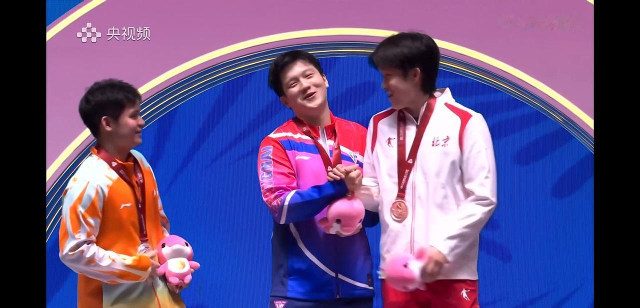 全运会男单颁奖台上, 樊振东冠军, 林诗栋亚军, 王楚钦季军。 站在领奖台上, 林诗栋第一时间对樊振东表示祝贺, 紧接着王楚钦也与樊振东握手庆祝, 楚钦不知道说了什么, 樊振东笑着摇头, 哈哈东哥又谦虚了。 他们三个人站在领奖台上, 中国男乒最强有力的天团。