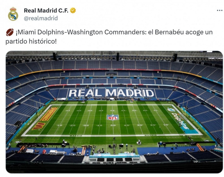 皇马官方社媒晒出伯纳乌球场准备就绪的照片,配文:“迈阿密海豚vs华盛顿指挥官,伯纳乌球场将迎来一场历史性的比赛。”