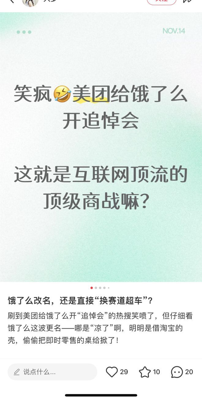 但请注意,所有对外沟通,都应该“师出有名”,且“贴合业务”。不应该“抖机灵”,更不是比遣词造句和文学造诣。以本案为例,美团“半路开追悼会”,实在看不太懂背后的业务逻辑,而饿了么则是“较克制回应”+“给用户发红包”,策略就比较清晰:不打口水战+给用户真实惠。