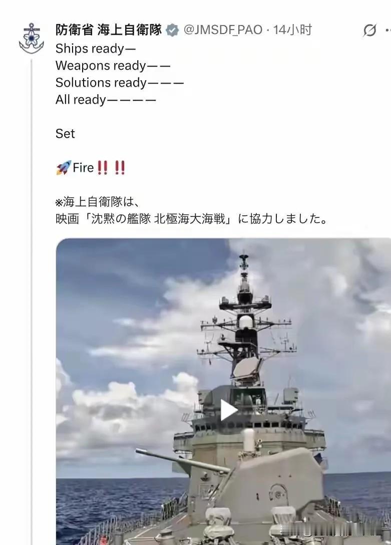 率先开火?中国刚公布黄海演习,日本自卫队就抢先发视频挑衅 11月15号,我们的海事单位对外发布了从17号一直到19号将会在黄海中部海域进行军事实弹演习。 从地区局势背景来看,此次演习与近期日本涉台言论有着密切的联系,应该是我军作出的一种战略性震慑行动。 日本海上自卫队抢在我们军演前48小时,突然在社交媒体上发布了一段视频,画面里舰炮怒吼、导弹升空,配文还带着火药味:“舰船准备好了,武器准备好了,解决方案准备好了,一切就绪,预备,开火!” 有意思的是,这段看起来很猛的视频并非真实军演,而是从一部叫《沉默的舰队》的电影里剪出来的。电影上映都一个多月了,自卫队偏偏选在这个时间点发布,明显是刻意为之。 这种挑衅背后是日本首相高市早苗近期不断抛出的涉台危险言论,她公然鼓吹“台湾有事就是日本有事”,甚至暗示日本可能军事介入。这已经触碰了中方底线,中方反应当然强硬。外交部、国防部多部门接连发声,更罕见地用中文、日文、英文三语发布警告海报,直接点明“如日方胆敢武力介入台海局势,中方必将迎头痛击”。这种跨语种、跨平台的同步施压,传递的信号非常清晰。 中方选择的黄海军演地点也暗含深意。黄海虽然不直接对着台湾,却是连接中日韩海军活动的敏感海域,距离美日韩军事协作区域很近。解放军在这里进行实弹射击,而非一般训练,就是明确告诉日方:政治挑衅会换来实战回应。相比日本用电影片段“亮肌肉”,中方直接把战舰开进相关海域,行动比文宣更有说服力。 这场隔空对阵已经超越了传统的外交吵架,变成了军方主导的舆论战和认知战。日本让自卫队直接发视频,而不是通过外务省交涉,说明他们的对华信号机制变了,这其实增加了误判风险。中日之间的防务热线几乎形同虚设,一旦局势升温,很容易从隔空对阵变成真实对峙。 各位读者你们怎么看?欢迎在评论区讨论。