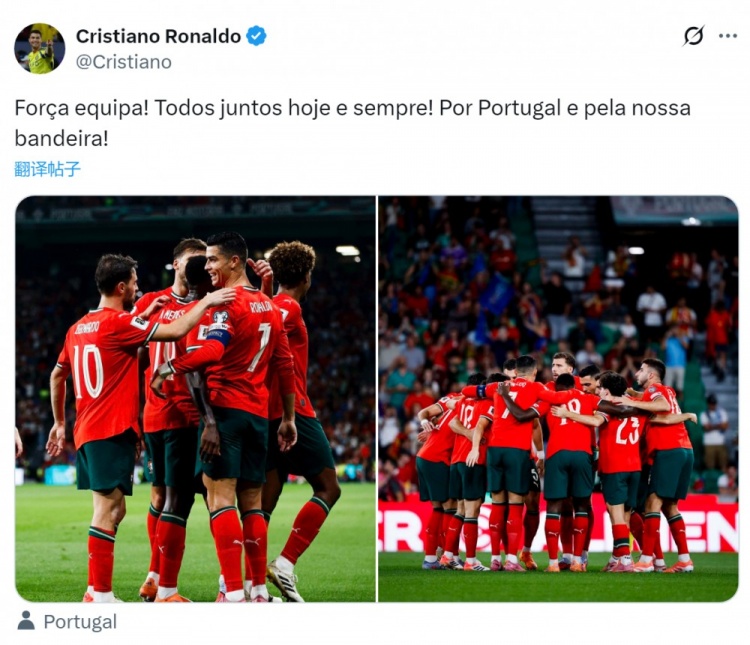 C罗染红停赛,将缺席这场世预赛收官战。C罗在社交媒体上晒出与队友们的合照,并写道:“加油葡萄牙队!今天到永远,我们始终团结一心!为葡萄牙和我们的国旗而战!”