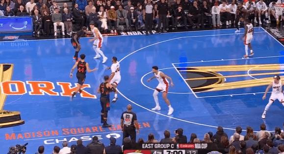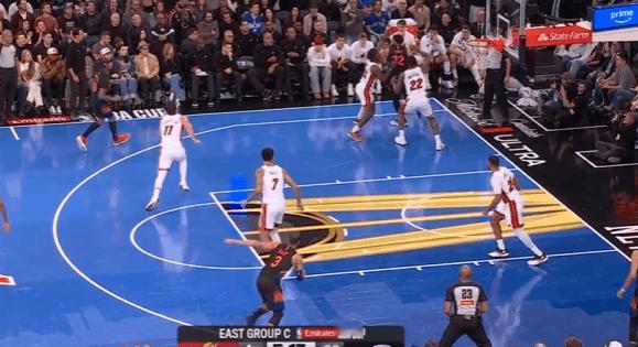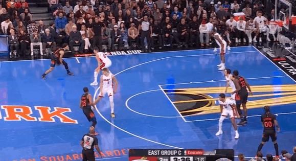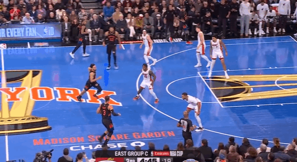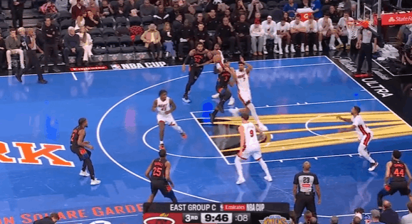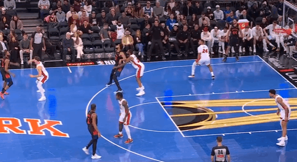 尼克斯观察:沙梅特36分生涯之夜沙梅特在尼克斯对阵热火的比赛中,打出了自己职业生涯最佳的一场比赛:登场37分钟,19中12高效砍下36分3助攻2篮板。12颗运动战进球,36分的单场得分均创下了沙梅特的生涯最高纪录。图1哈特和唐斯强侧边路挡拆配合,沙梅特在挡拆行进间从弱侧沿底线空手移动到强侧,造成鲍威尔和小米切尔的防无球沟通失误,因此获得了一次底角空位机会。图2弱侧接应,接球后没有投篮空间,炸球衔接横撤步坚决出手。图3唐斯肘区背身要位打威金斯,鲍威尔从身后杀出掏球没有成功,沙梅特顺势启动底角空切,接唐斯传球隔扣补防的韦尔。图4热火联防,小麦和唐斯强侧挡拆转弱侧,克拉克森弱侧接球后吸引鲍威尔上提,转移给底角的沙梅特。图5早期进攻,刚过半场顺势为持球的哈特做“幽灵掩护”(Ghost Screen)兜至底角接球,鲍威尔堵住左侧,将沙梅特往边角驱赶,沙梅特顺势沿底线突破摆脱鲍威尔后上篮得手。图6手感和自信来了之后直接持球单打,胯下衔接跳步犹豫后直接启动右路突破,躲过约维奇刷卡,突破摆脱丰泰后上篮得手。图7“Middle Zomm”的变种,克拉克森借沙梅特的掩护后直接卷切篮下,随后沙梅特迅速转身与哈特衔接手递手配合,沙梅特哈特手递手后直接炸球出手持球投。图8热火夹击唐斯,就近轮转,哈特空切接应的同时带走鲍威尔,接球后中转给外线的沙梅特。沙梅特面对扑防过来的韦尔右路突破攻击前脚,随后突破挑篮得手。