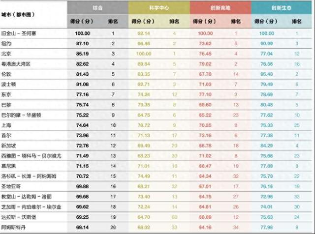 数据显示,就综合科技创新实力而言,北京得分85.19,连续3年位列三甲,处于第一梯队。粤港澳大湾区跃升2名至第4,处于第二梯队领先位置,在前10强城市(都市圈)中进步最为显著。上海则处于第三梯队,排名第10。