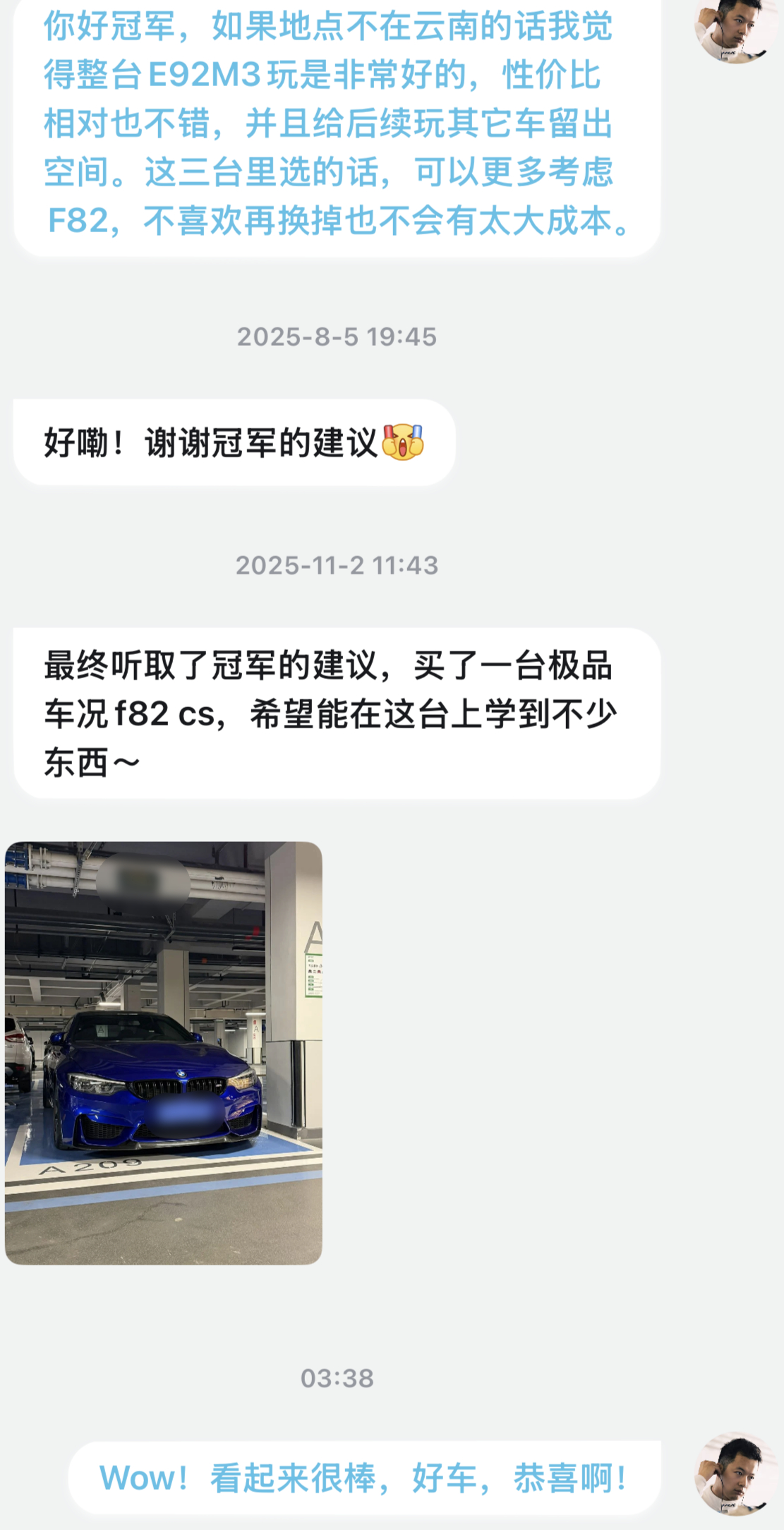 真的太羡慕我的粉丝了,总能买到这么香的车! 你好冠军,如果地点不在云南的话我觉得整台E92M3玩是非常好的,性价比相对也不错,并且给后续玩其它车留出空间。这三台里选的话,可以更多考虑 F82,不喜欢再换掉也不会有太大成本。