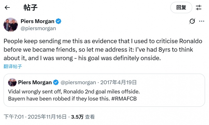 而在今日,摩根在社媒再次评论了这条推文,表示:人们不断给我发这个(推文),说是我曾经批评C罗的证据,那是在我和C罗成为朋友之前。所以现在我想对此事进行回应:在经过8年的思考后,我错了,C罗这个球绝对没有越位。