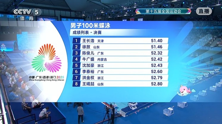 在今晚进行的全运会游泳男子100米蝶泳决赛中,天津队王长浩51.40秒获得金牌,山东队徐放51.46秒获得银牌,广东队陈俊儿52.32秒获得铜牌。
