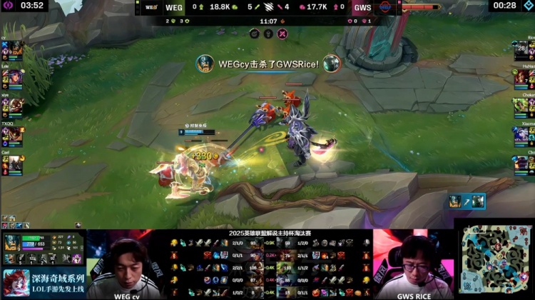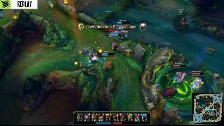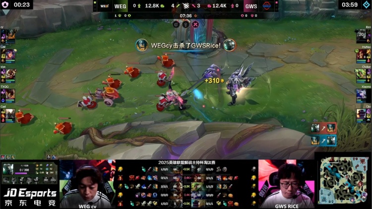 [12:25]mage艾希下路配合PYL布隆逮捕瞳夕吉格斯,mage拿到人头,GWS经济落后1k。